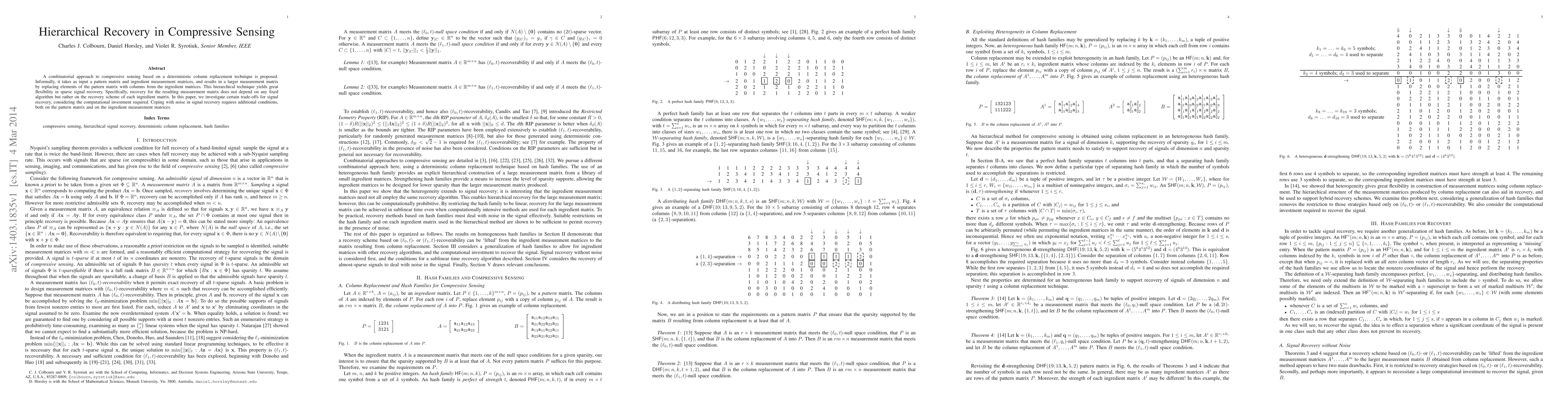 A combinatorial approach to compressive sensing based on a deterministic column replacement technique is proposed. Informally, it takes as input a pattern matrix and ingredient measurement matrices, and results in a larger measurement matrix by replacing elements of the pattern matrix with columns from the ingredient matrices. This hierarchical technique yields great flexibility in sparse signal recovery. Specifically, recovery for the resulting measurement matrix does not depend on any fixed algorithm but rather on the recovery scheme of each ingredient matrix. In this paper, we investigate certain trade-offs for signal recovery, considering the computational investment required. Coping with noise in signal recovery requires additional conditions, both on the pattern matrix and on the ingredient measurement matrices.