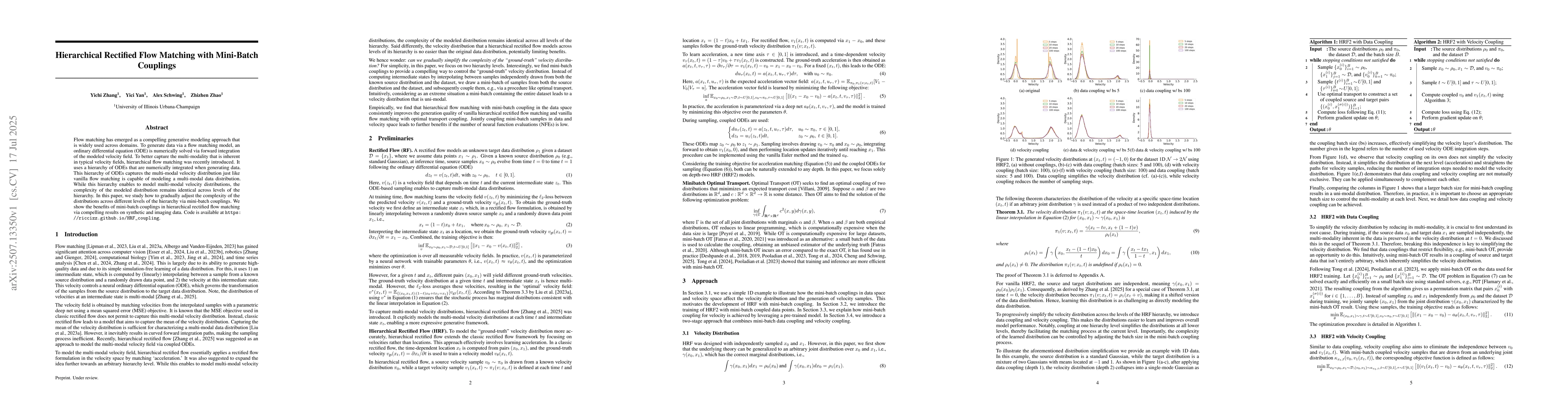 Flow matching has emerged as a compelling generative modeling approach that is widely used across domains. To generate data via a flow matching model, an ordinary differential equation (ODE) is numerically solved via forward integration of the modeled velocity field. To better capture the multi-modality that is inherent in typical velocity fields, hierarchical flow matching was recently introduced. It uses a hierarchy of ODEs that are numerically integrated when generating data. This hierarchy of ODEs captures the multi-modal velocity distribution just like vanilla flow matching is capable of modeling a multi-modal data distribution. While this hierarchy enables to model multi-modal velocity distributions, the complexity of the modeled distribution remains identical across levels of the hierarchy. In this paper, we study how to gradually adjust the complexity of the distributions across different levels of the hierarchy via mini-batch couplings. We show the benefits of mini-batch couplings in hierarchical rectified flow matching via compelling results on synthetic and imaging data. Code is available at https://riccizz.github.io/HRF_coupling.