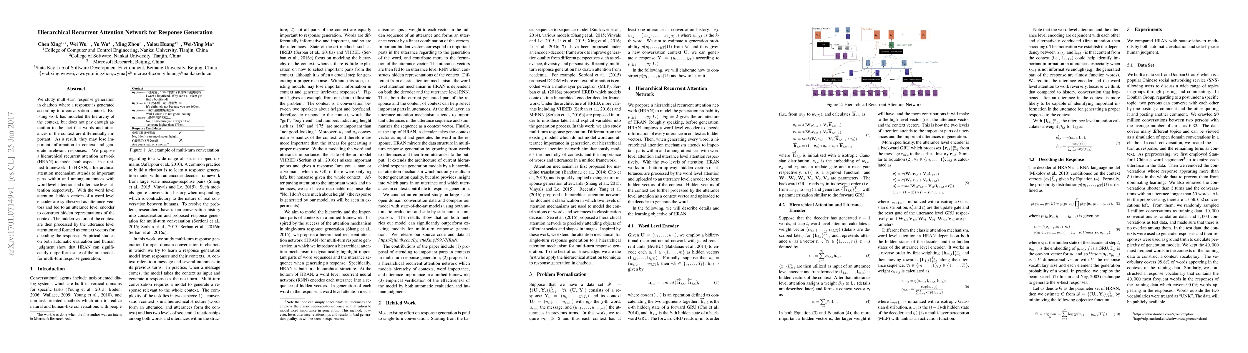 The paper proposes a hierarchical recurrent attention network (HRAN) to improve multi-turn response generation in chatbots by attending to differentially important words and utterances. Empirical results show HRAN outperforms existing models in both automatic and human evaluations.