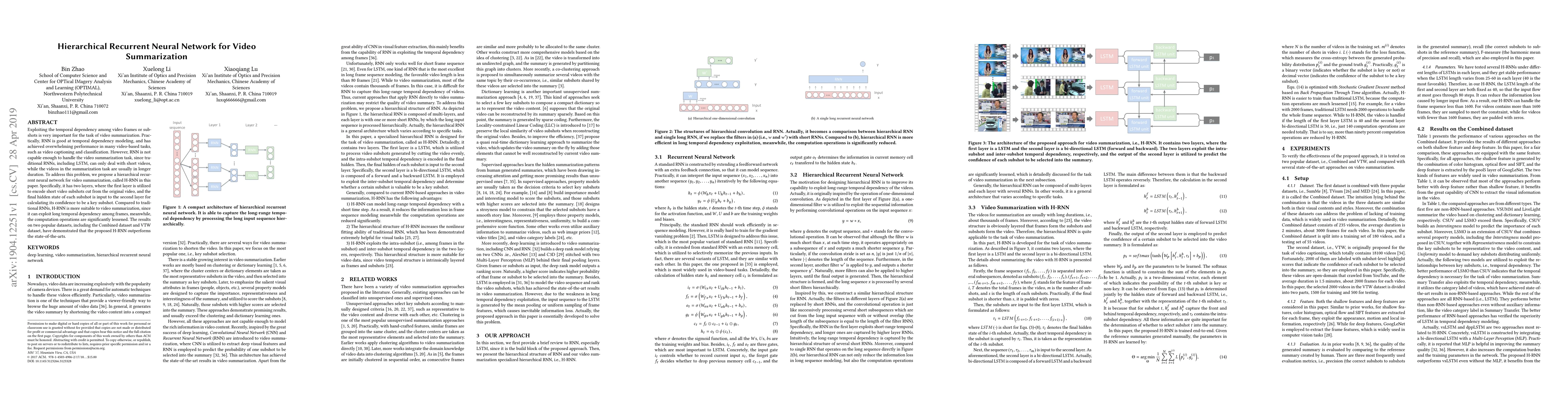 This paper proposes a hierarchical recurrent neural network (H-RNN) for video summarization to handle long videos by encoding short subshots and leveraging long temporal dependencies. The H-RNN outperforms traditional RNNs and state-of-the-art methods on two datasets.