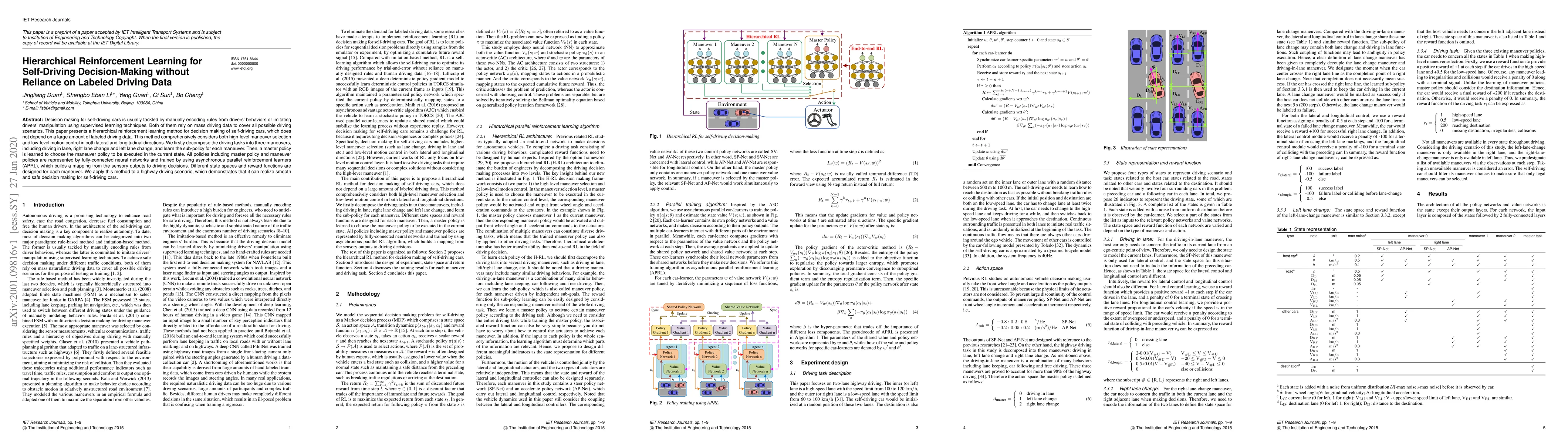 The paper proposes a hierarchical reinforcement learning (H-RL) method for self-driving decision-making, decomposing driving tasks into three maneuvers: driving in lane, right lane change, and left lane change. It uses asynchronous parallel reinforcement learners (APRL) to train all policies, including master policy and maneuver policies, represented by fully-connected neural networks.