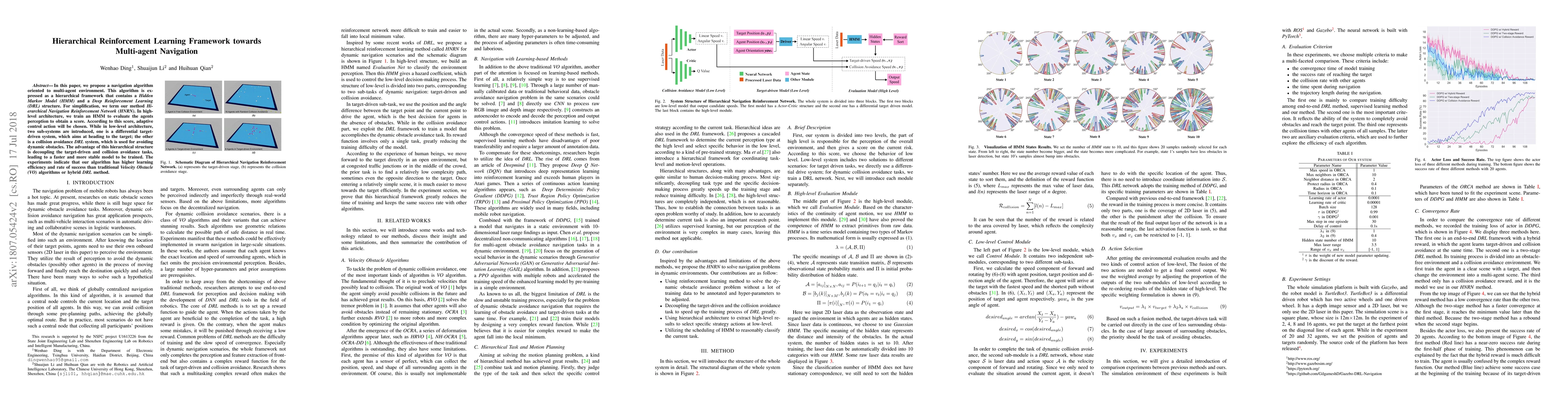 In this paper, we propose a navigation algorithm oriented to multi-agent environment. This algorithm is expressed as a hierarchical framework that contains a Hidden Markov Model (HMM) and a Deep Reinforcement Learning (DRL) structure. For simplification, we term our method Hierarchical Navigation Reinforcement Network (HNRN). In high- level architecture, we train an HMM to evaluate the agent's perception to obtain a score. According to this score, adaptive control action will be chosen. While in low-level architecture, two sub-systems are introduced, one is a differential target- driven system, which aims at heading to the target; the other is a collision avoidance DRL system, which is used for avoiding dynamic obstacles. The advantage of this hierarchical structure is decoupling the target-driven and collision avoidance tasks, leading to a faster and more stable model to be trained. The experiments indicate that our algorithm has higher learning efficiency and rate of success than traditional Velocity Obstacle (VO) algorithms or hybrid DRL method.
