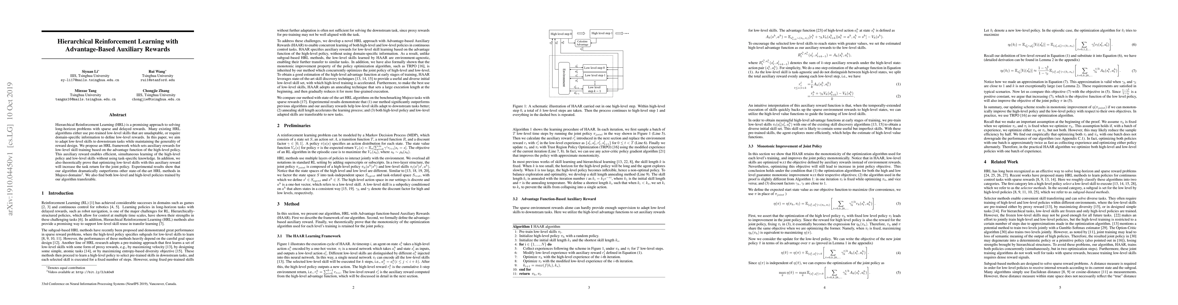 This paper proposes an HRL framework that uses advantage-based auxiliary rewards to train adaptable low-level skills without requiring task-specific knowledge, significantly improving performance over existing methods in Mujoco environments. The framework enables simultaneous learning of high-level and low-level policies, enhancing the overall task return.