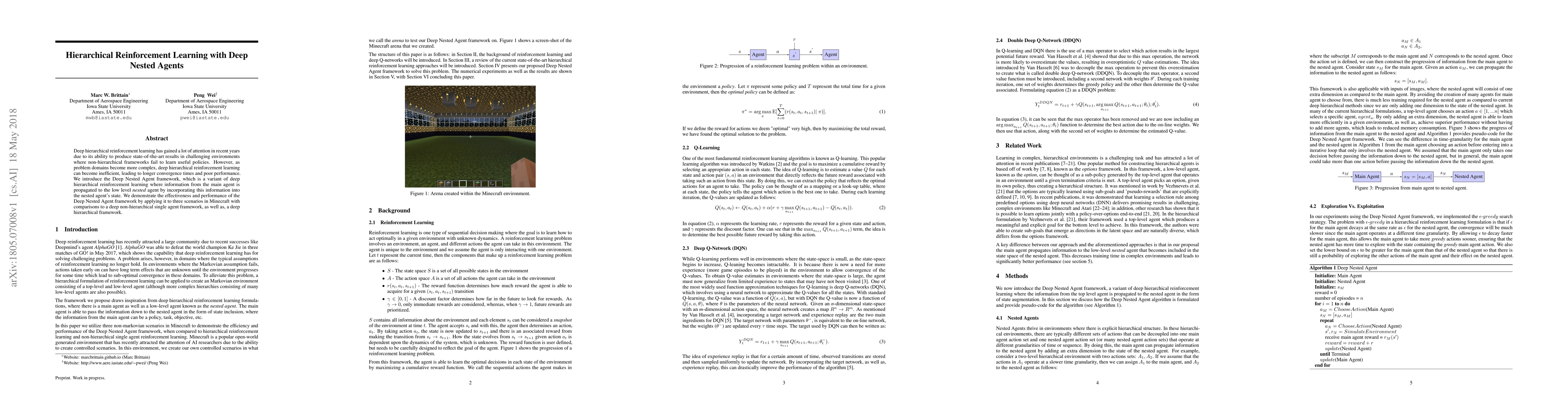 Deep hierarchical reinforcement learning has gained a lot of attention in recent years due to its ability to produce state-of-the-art results in challenging environments where non-hierarchical frameworks fail to learn useful policies. However, as problem domains become more complex, deep hierarchical reinforcement learning can become inefficient, leading to longer convergence times and poor performance. We introduce the Deep Nested Agent framework, which is a variant of deep hierarchical reinforcement learning where information from the main agent is propagated to the low level $nested$ agent by incorporating this information into the nested agent's state. We demonstrate the effectiveness and performance of the Deep Nested Agent framework by applying it to three scenarios in Minecraft with comparisons to a deep non-hierarchical single agent framework, as well as, a deep hierarchical framework.