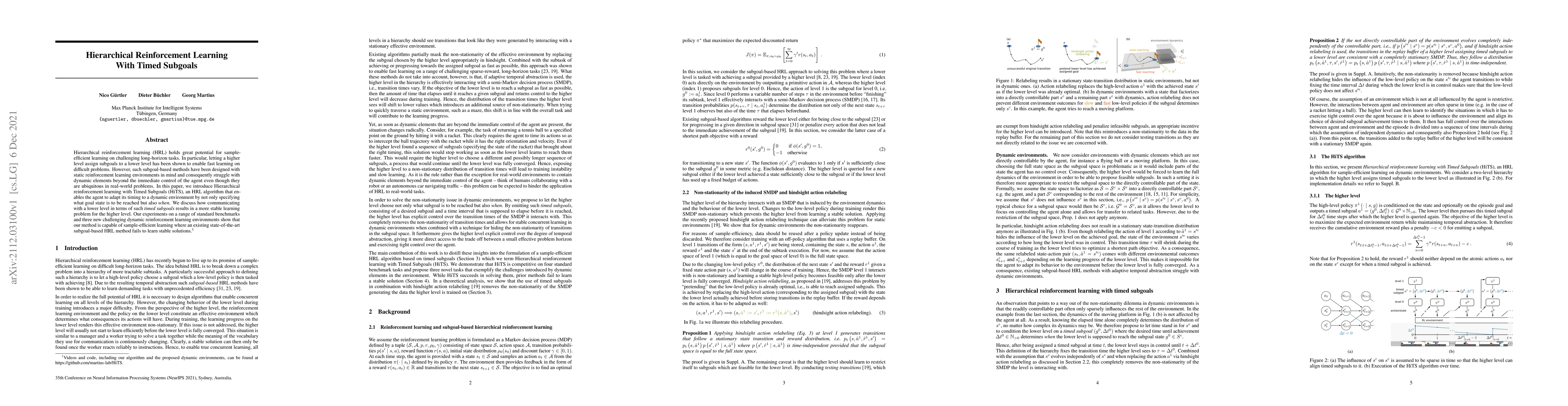 Hierarchical reinforcement learning (HRL) holds great potential for sample-efficient learning on challenging long-horizon tasks. In particular, letting a higher level assign subgoals to a lower level has been shown to enable fast learning on difficult problems. However, such subgoal-based methods have been designed with static reinforcement learning environments in mind and consequently struggle with dynamic elements beyond the immediate control of the agent even though they are ubiquitous in real-world problems. In this paper, we introduce Hierarchical reinforcement learning with Timed Subgoals (HiTS), an HRL algorithm that enables the agent to adapt its timing to a dynamic environment by not only specifying what goal state is to be reached but also when. We discuss how communicating with a lower level in terms of such timed subgoals results in a more stable learning problem for the higher level. Our experiments on a range of standard benchmarks and three new challenging dynamic reinforcement learning environments show that our method is capable of sample-efficient learning where an existing state-of-the-art subgoal-based HRL method fails to learn stable solutions.