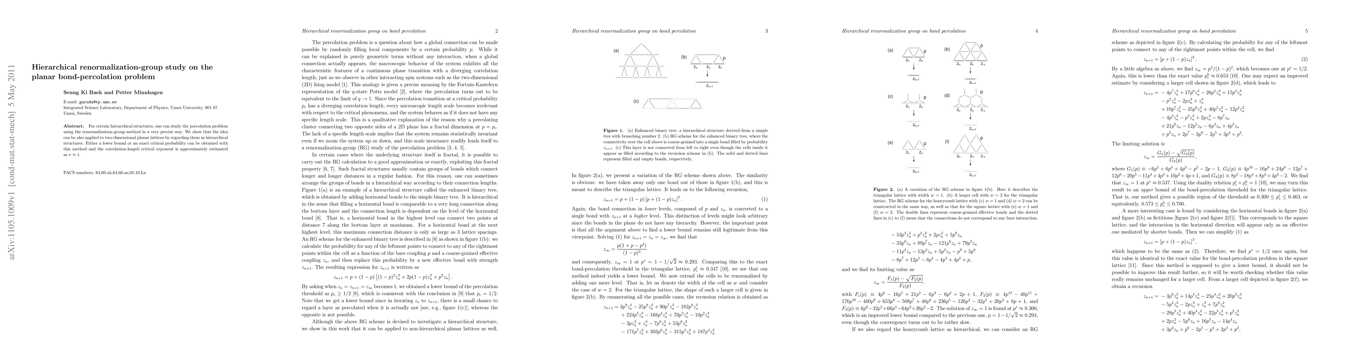 For certain hierarchical structures, one can study the percolation problem using the renormalization-group method in a very precise way. We show that the idea can be also applied to two-dimensional planar lattices by regarding them as hierarchical structures. Either a lower bound or an exact critical probability can be obtained with this method and the correlation-length critical exponent is approximately estimated as $\nu \approx 1$.