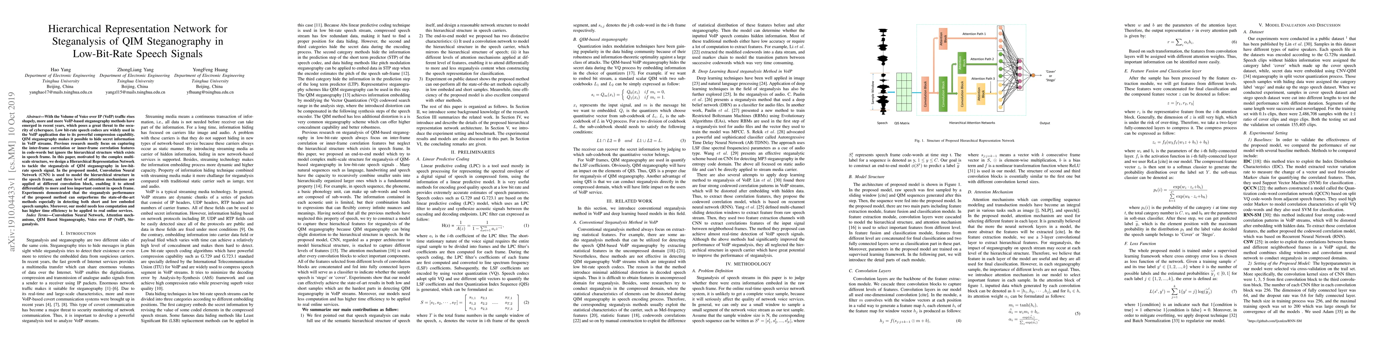 This paper introduces a Hierarchical Representation Network for steganalysis of Quadrature Amplitude Modulation (QIM) steganography in low-bit-rate speech signals. The proposed model leverages Convolutional Neural Networks (CNN) and multi-level attention mechanisms to capture the hierarchical structure of speech frames, enhancing detection performance over existing methods, especially for short and low embedded speech samples. The model also demonstrates computational efficiency suitable for real-time applications.