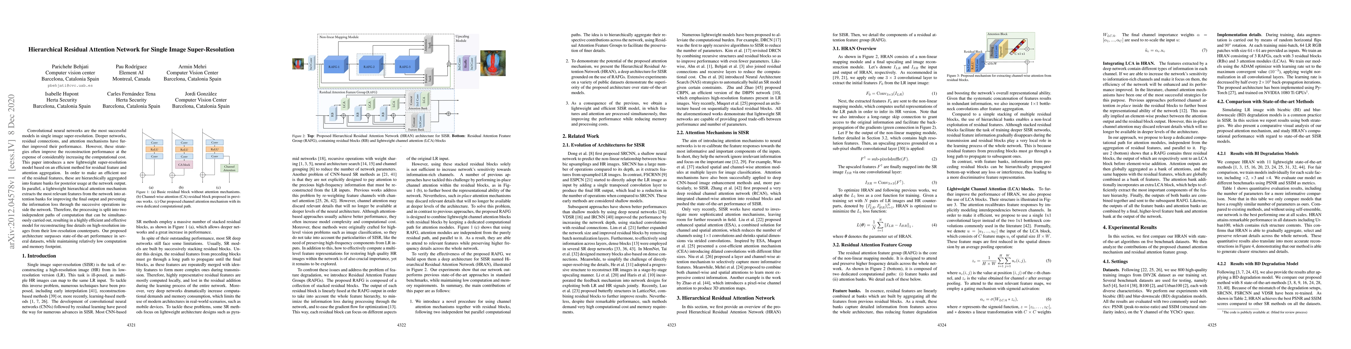 This paper proposes a hierarchical residual attention network for single image super-resolution, combining efficient residual feature aggregation and a lightweight hierarchical attention mechanism to improve performance while minimizing computational costs. The model achieves state-of-the-art results with lower computational and memory usage.