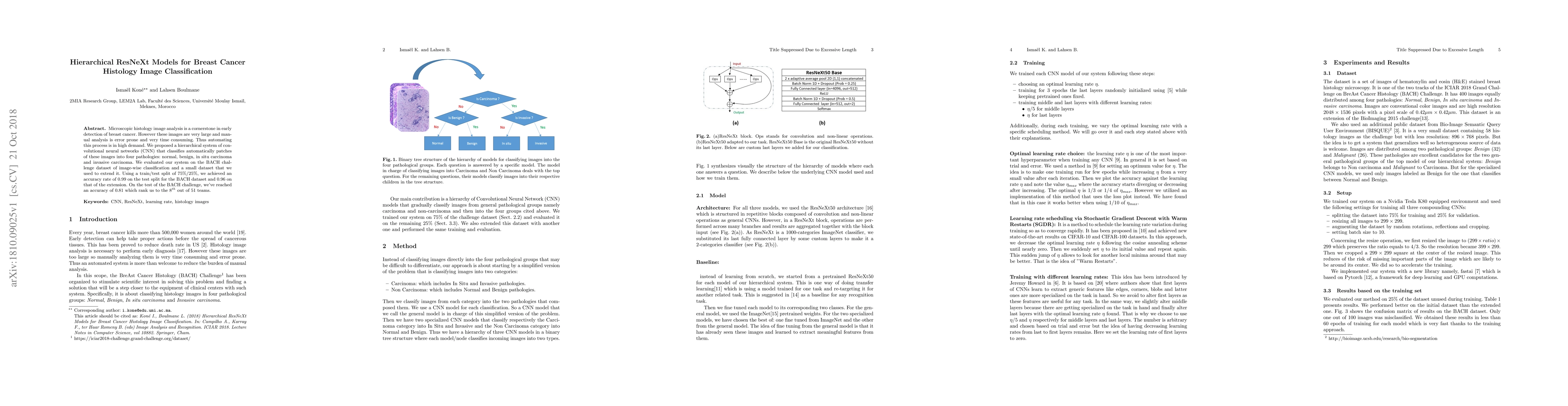 A hierarchical system of CNNs accurately classifies breast cancer histology images into four pathologies with high accuracy rates, showing promise for automating microscopic image analysis.