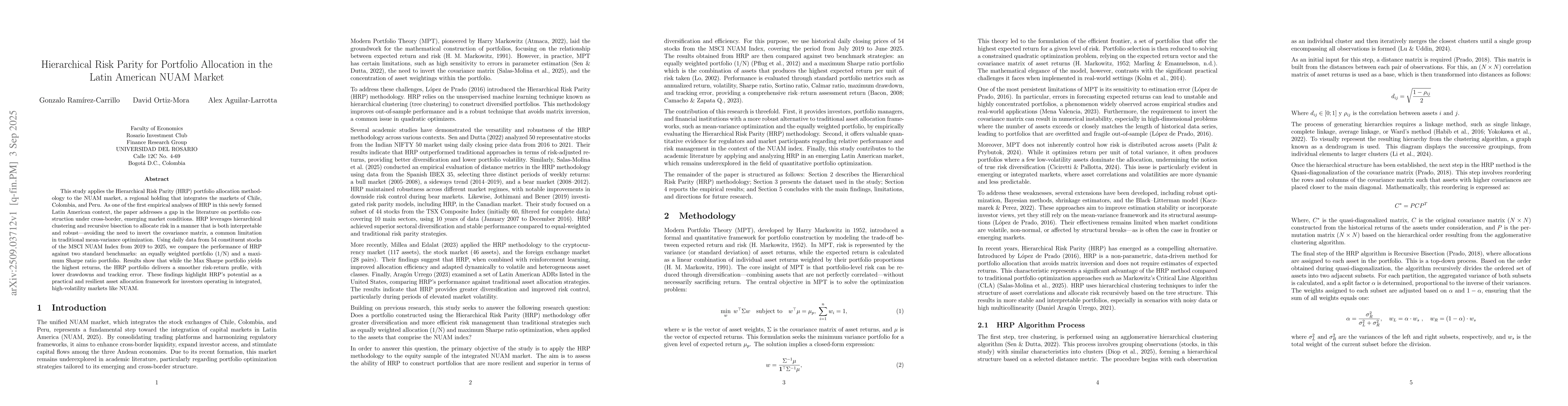 This study applies the Hierarchical Risk Parity (HRP) portfolio allocation methodology to the NUAM market, a regional holding that integrates the markets of Chile, Colombia and Peru. As one of the first empirical analyses of HRP in this newly formed Latin American context, the paper addresses a gap in the literature on portfolio construction under cross-border, emerging market conditions. HRP leverages hierarchical clustering and recursive bisection to allocate risk in a manner that is both interpretable and robust--avoiding the need to invert the covariance matrix, a common limitation in the traditional mean-variance optimization. Using daily data from 54 constituent stocks of the MSCI NUAM Index from 2019 to 2025, we compare the performance of HRP against two standard benchmarks: an equally weighted portfolio (1/N) and a maximum Sharpe ratio portfolio. Results show that while the Max Sharpe portfolio yields the highest return, the HRP portfolio delivers a smoother risk-return profile, with lower drawdowns and tracking error. These findings highlight HRP's potential as a practical and resilient asset allocation framework for investors operating in the integrated, high-volatility markets like NUAM.