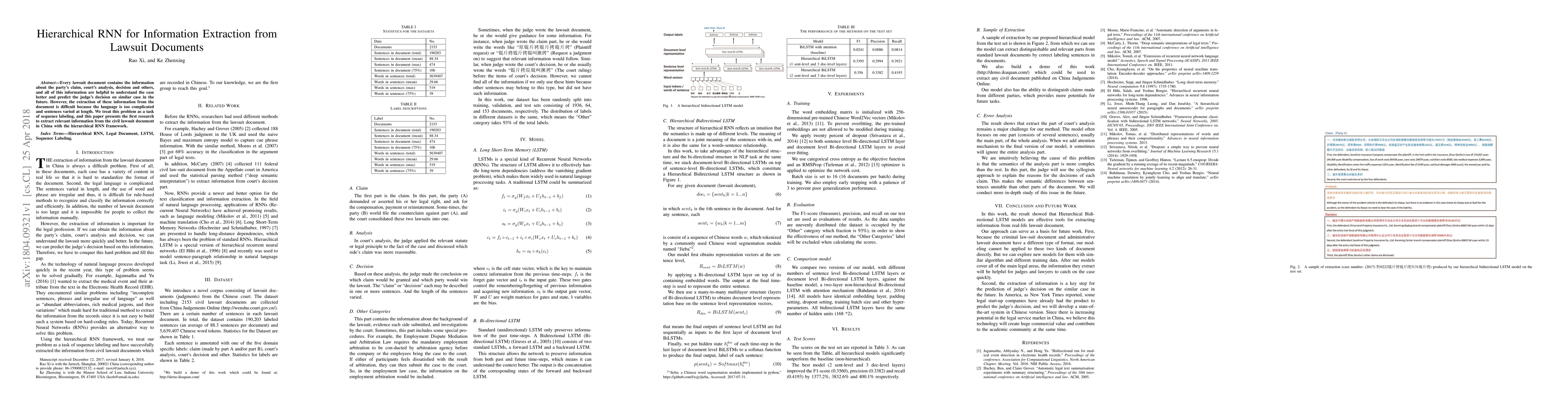 Every lawsuit document contains the information about the party's claim, court's analysis, decision and others, and all of this information are helpful to understand the case better and predict the judge's decision on similar case in the future. However, the extraction of these information from the document is difficult because the language is too complicated and sentences varied at length. We treat this problem as a task of sequence labeling, and this paper presents the first research to extract relevant information from the civil lawsuit document in China with the hierarchical RNN framework.