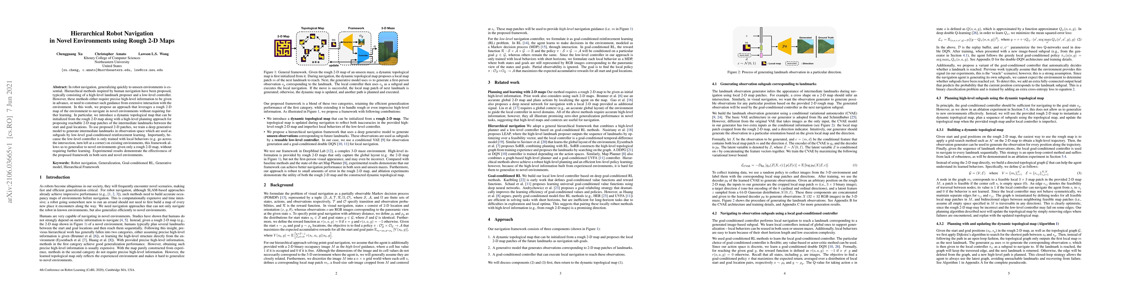 In robot navigation, generalizing quickly to unseen environments is essential. Hierarchical methods inspired by human navigation have been proposed, typically consisting of a high-level landmark proposer and a low-level controller. However, these methods either require precise high-level information to be given in advance or need to construct such guidance from extensive interaction with the environment. In this work, we propose an approach that leverages a rough 2-D map of the environment to navigate in novel environments without requiring further learning. In particular, we introduce a dynamic topological map that can be initialized from the rough 2-D map along with a high-level planning approach for proposing reachable 2-D map patches of the intermediate landmarks between the start and goal locations. To use proposed 2-D patches, we train a deep generative model to generate intermediate landmarks in observation space which are used as subgoals by low-level goal-conditioned reinforcement learning. Importantly, because the low-level controller is only trained with local behaviors (e.g. go across the intersection, turn left at a corner) on existing environments, this framework allows us to generalize to novel environments given only a rough 2-D map, without requiring further learning. Experimental results demonstrate the effectiveness of the proposed framework in both seen and novel environments.