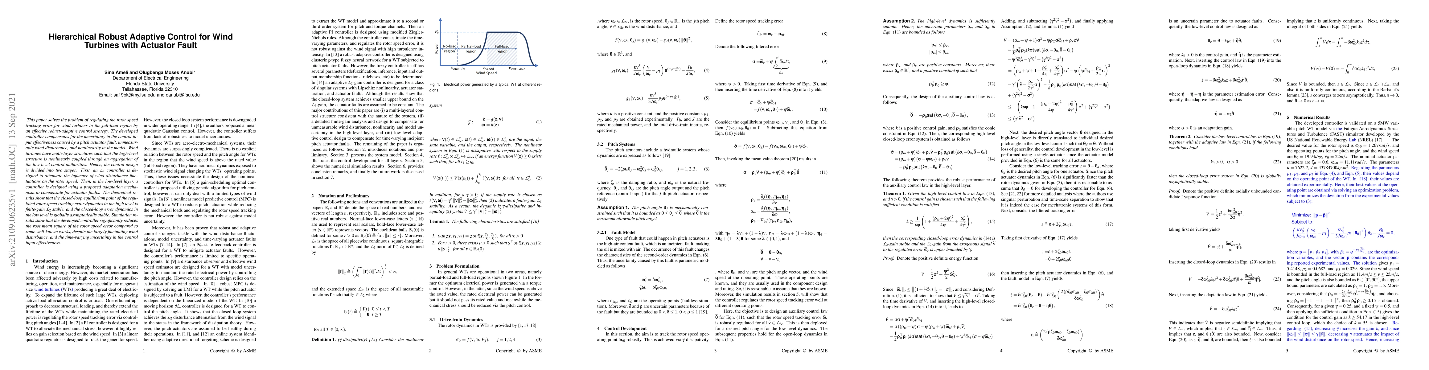This paper solves the problem of regulating the rotor speed tracking error for wind turbines in the full-load region by an effective robust-adaptive control strategy. The developed controller compensates for the uncertainty in the control input effectiveness caused by a pitch actuator fault, unmeasurable wind disturbance, and nonlinearity in the model. Wind turbines have multi-layer structures such that the high-level structure is nonlinearly coupled through an aggregation of the low-level control authorities. Hence, the control design is divided into two stages. First, an $\mathcal{L}_2$ controller is designed to attenuate the influence of wind disturbance fluctuations on the rotor speed. Then, in the low-level layer, a controller is designed using a proposed adaptation mechanism to compensate for actuator faults. The theoretical results show that the closed-loop equilibrium point of the regulated rotor speed tracking error dynamics in the high level is finite-gain $\mathcal{L}_2$ stable, and the closed-loop error dynamics in the low level is globally asymptotically stable. Simulation results show that the developed controller significantly reduces the root mean square of the rotor speed error compared to some well-known works, despite the largely fluctuating wind disturbance, and the time-varying uncertainty in the control input effectiveness.