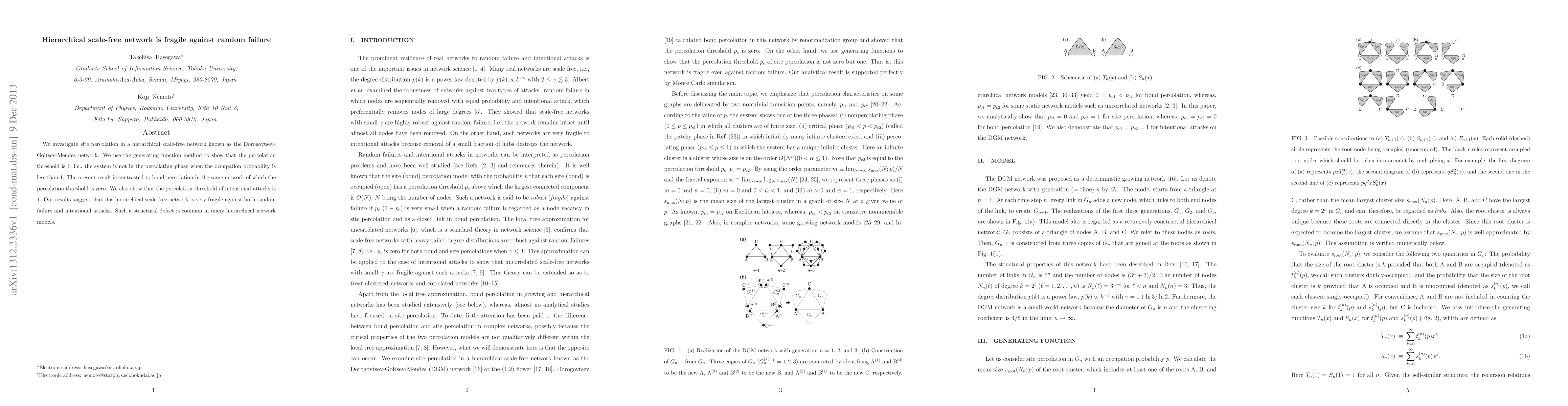 This paper demonstrates that the hierarchical scale-free Dorogovtsev-Goltsev-Mendes network is highly fragile against random failure and intentional attacks, with a percolation threshold of 1 for both types of perturbations, contrasting with a threshold of zero for bond percolation.