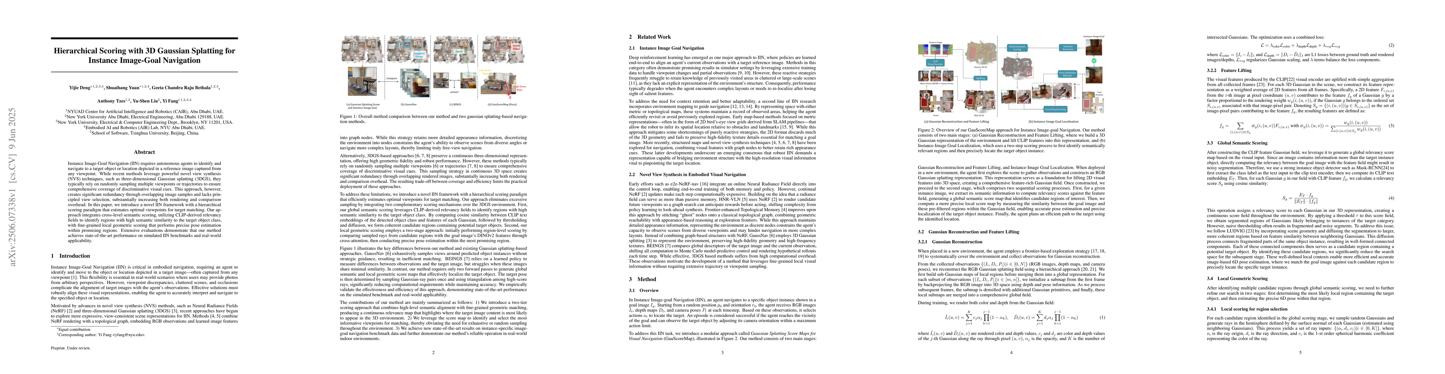 Instance Image-Goal Navigation (IIN) requires autonomous agents to identify and navigate to a target object or location depicted in a reference image captured from any viewpoint. While recent methods leverage powerful novel view synthesis (NVS) techniques, such as three-dimensional Gaussian splatting (3DGS), they typically rely on randomly sampling multiple viewpoints or trajectories to ensure comprehensive coverage of discriminative visual cues. This approach, however, creates significant redundancy through overlapping image samples and lacks principled view selection, substantially increasing both rendering and comparison overhead. In this paper, we introduce a novel IIN framework with a hierarchical scoring paradigm that estimates optimal viewpoints for target matching. Our approach integrates cross-level semantic scoring, utilizing CLIP-derived relevancy fields to identify regions with high semantic similarity to the target object class, with fine-grained local geometric scoring that performs precise pose estimation within promising regions. Extensive evaluations demonstrate that our method achieves state-of-the-art performance on simulated IIN benchmarks and real-world applicability.