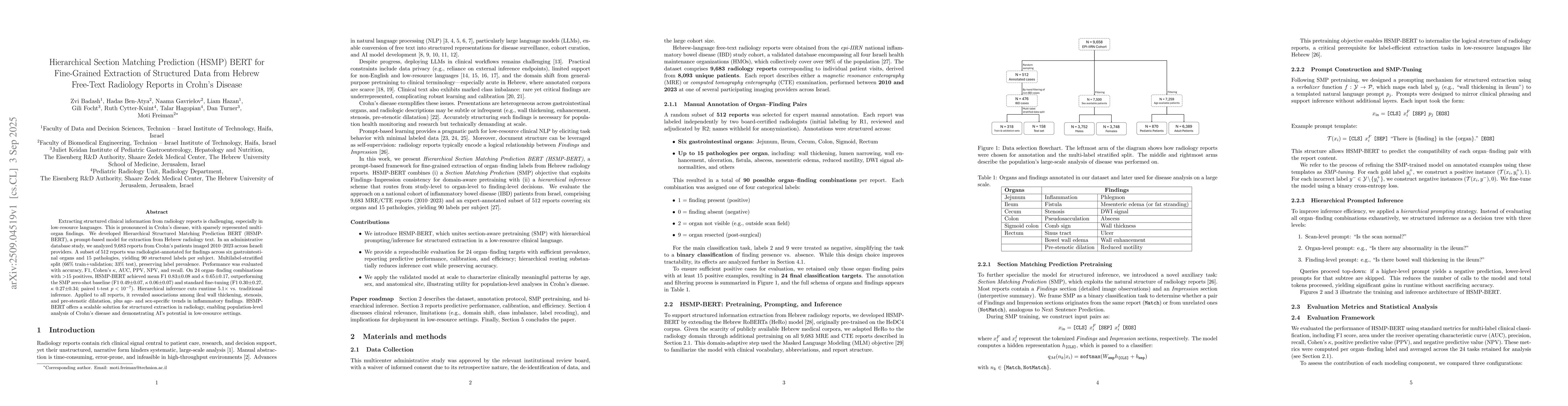 Extracting structured clinical information from radiology reports is challenging, especially in low-resource languages. This is pronounced in Crohn's disease, with sparsely represented multi-organ findings. We developed Hierarchical Structured Matching Prediction BERT (HSMP-BERT), a prompt-based model for extraction from Hebrew radiology text. In an administrative database study, we analyzed 9,683 reports from Crohn's patients imaged 2010-2023 across Israeli providers. A subset of 512 reports was radiologist-annotated for findings across six gastrointestinal organs and 15 pathologies, yielding 90 structured labels per subject. Multilabel-stratified split (66% train+validation; 33% test), preserving label prevalence. Performance was evaluated with accuracy, F1, Cohen's $\kappa$, AUC, PPV, NPV, and recall. On 24 organ-finding combinations with $>$15 positives, HSMP-BERT achieved mean F1 0.83$\pm$0.08 and $\kappa$ 0.65$\pm$0.17, outperforming the SMP zero-shot baseline (F1 0.49$\pm$0.07, $\kappa$ 0.06$\pm$0.07) and standard fine-tuning (F1 0.30$\pm$0.27, $\kappa$ 0.27$\pm$0.34; paired t-test $p < 10^{-7}$). Hierarchical inference cuts runtime 5.1$\times$ vs. traditional inference. Applied to all reports, it revealed associations among ileal wall thickening, stenosis, and pre-stenotic dilatation, plus age- and sex-specific trends in inflammatory findings. HSMP-BERT offers a scalable solution for structured extraction in radiology, enabling population-level analysis of Crohn's disease and demonstrating AI's potential in low-resource settings.