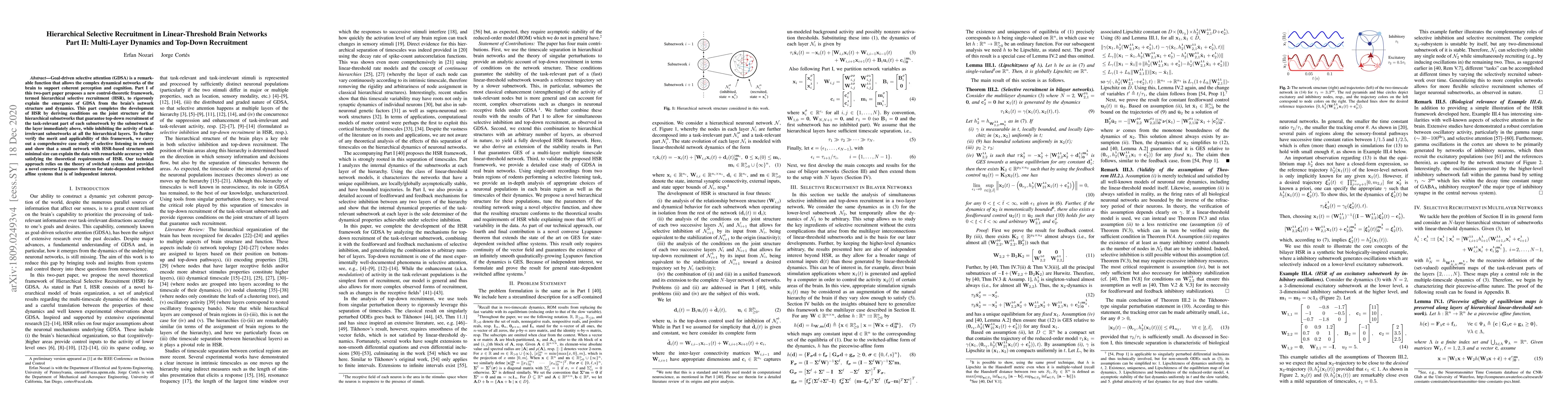 Goal-driven selective attention (GDSA) is a remarkable function that allows the complex dynamical networks of the brain to support coherent perception and cognition. Part I of this two-part paper proposes a new control-theoretic framework, termed hierarchical selective recruitment (HSR), to rigorously explain the emergence of GDSA from the brain's network structure and dynamics. This part completes the development of HSR by deriving conditions on the joint structure of the hierarchical subnetworks that guarantee top-down recruitment of the task-relevant part of each subnetwork by the subnetwork at the layer immediately above, while inhibiting the activity of task-irrelevant subnetworks at all the hierarchical layers. To further verify the merit and applicability of this framework, we carry out a comprehensive case study of selective listening in rodents and show that a small network with HSR-based structure and minimal size can explain the data with remarkable accuracy while satisfying the theoretical requirements of HSR. Our technical approach relies on the theory of switched systems and provides a novel converse Lyapunov theorem for state-dependent switched affine systems that is of independent interest.