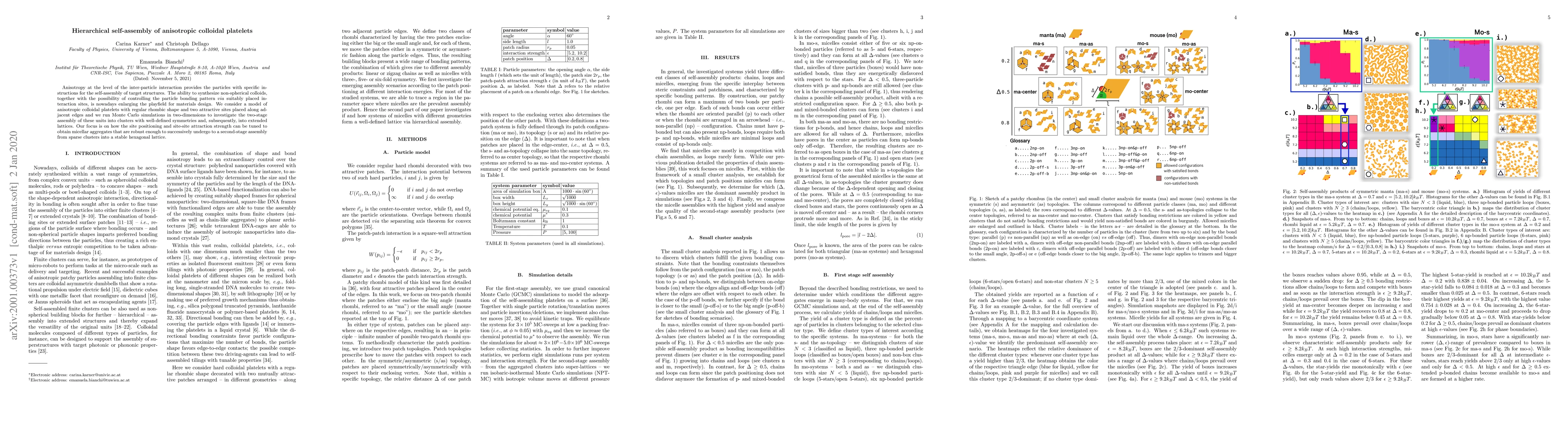 This paper investigates the hierarchical self-assembly of anisotropic colloidal platelets using Monte Carlo simulations. By tuning the placement and attraction strength of interaction sites, the researchers create rhombic platelet clusters with defined symmetries and stable hexagonal lattices.