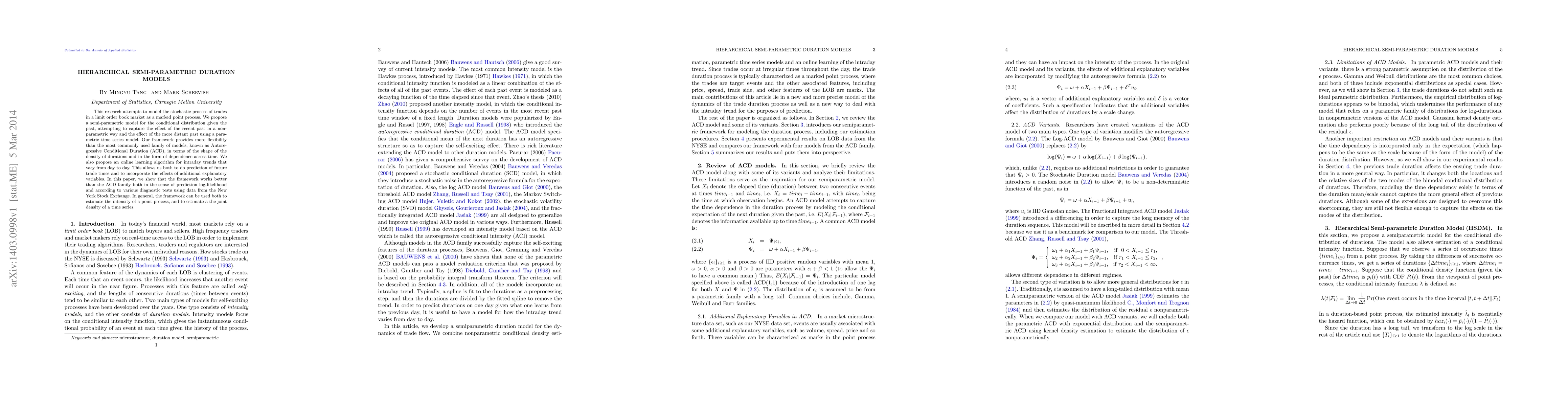 This research attempts to model the stochastic process of trades in a limit order book market as a marked point process. We propose a semi-parametric model for the conditional distribution given the past, attempting to capture the effect of the recent past in a nonparametric way and the effect of the more distant past using a parametric time series model. Our framework provides more flexibility than the most commonly used family of models, known as Autoregressive Conditional Duration (ACD), in terms of the shape of the density of durations and in the form of dependence across time. We also propose an online learning algorithm for intraday trends that vary from day to day. This allows us both to do prediction of future trade times and to incorporate the effects of additional explanatory variables. In this paper, we show that the framework works better than the ACD family both in the sense of prediction log-likelihood and according to various diagnostic tests using data from the New York Stock Exchange. In general, the framework can be used both to estimate the intensity of a point process, and to estimate a the joint density of a time series.