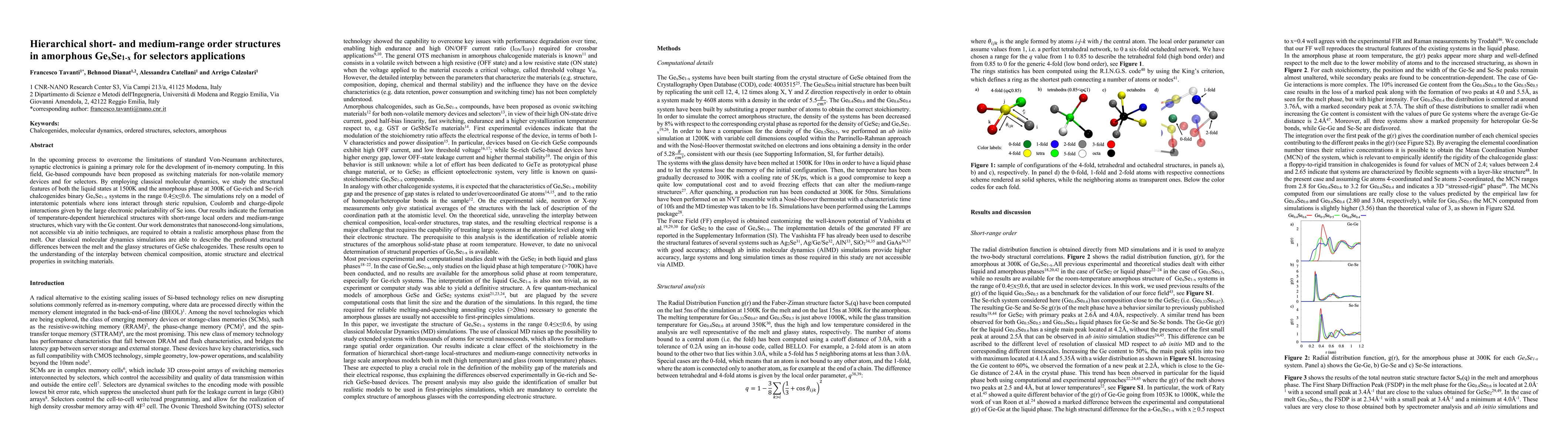 This study uses classical molecular dynamics simulations to analyze the hierarchical short- and medium-range order structures in Ge-Se amorphous compounds (GexSe1-x) for synaptic electronics applications. The research reveals temperature-dependent structural variations with Ge content, highlighting the need for nanosecond-long simulations to realistically model amorphous phases from the melt. These findings contribute to understanding the relationship between composition, atomic structure, and electrical properties in switching materials.
