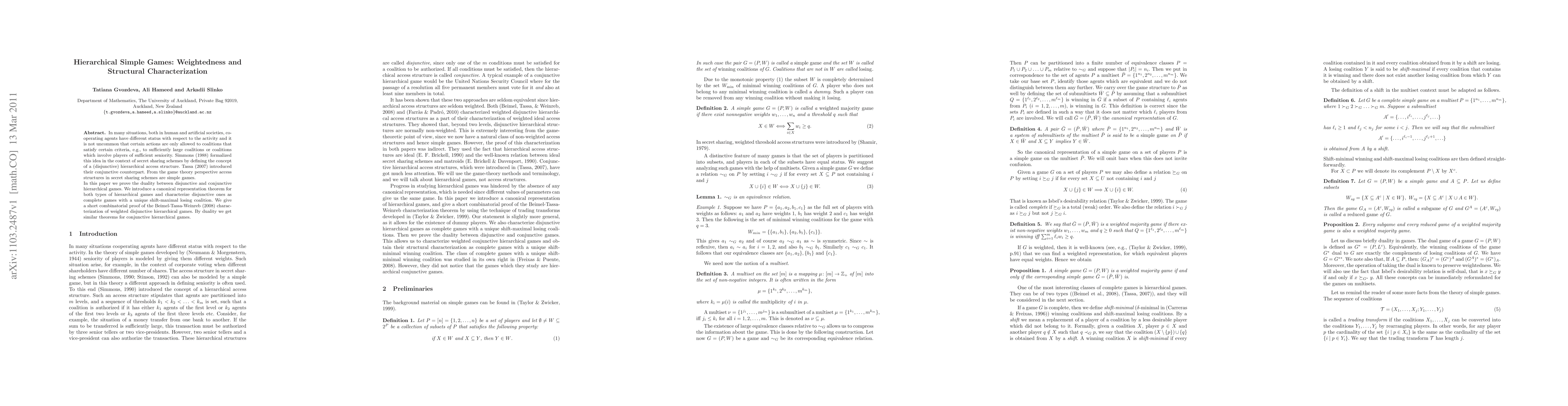 This paper explores the duality between disjunctive and conjunctive hierarchical simple games, introducing canonical representations and proving their characteristics. It establishes a unique shift-maximal losing coalition for disjunctive games and provides combinatorial proofs for weighted hierarchical games.