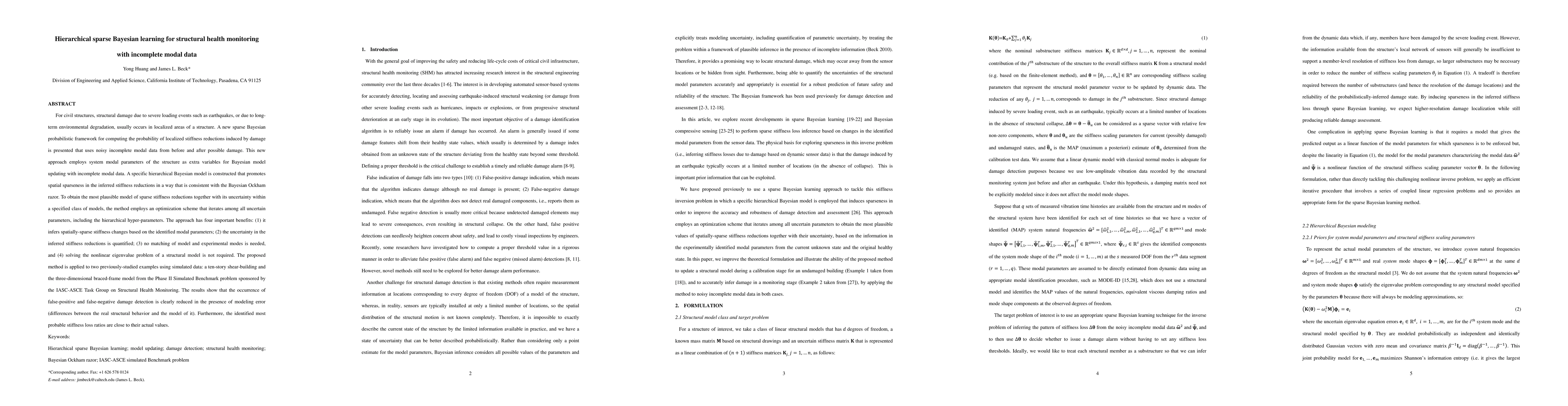 This paper proposes a hierarchical sparse Bayesian learning framework for structural health monitoring using incomplete modal data, enabling the inference of localized stiffness reductions without requiring mode matching or solving nonlinear eigenvalue problems. The method effectively reduces false-positive and false-negative damage detection and accurately identifies probable stiffness loss ratios.
