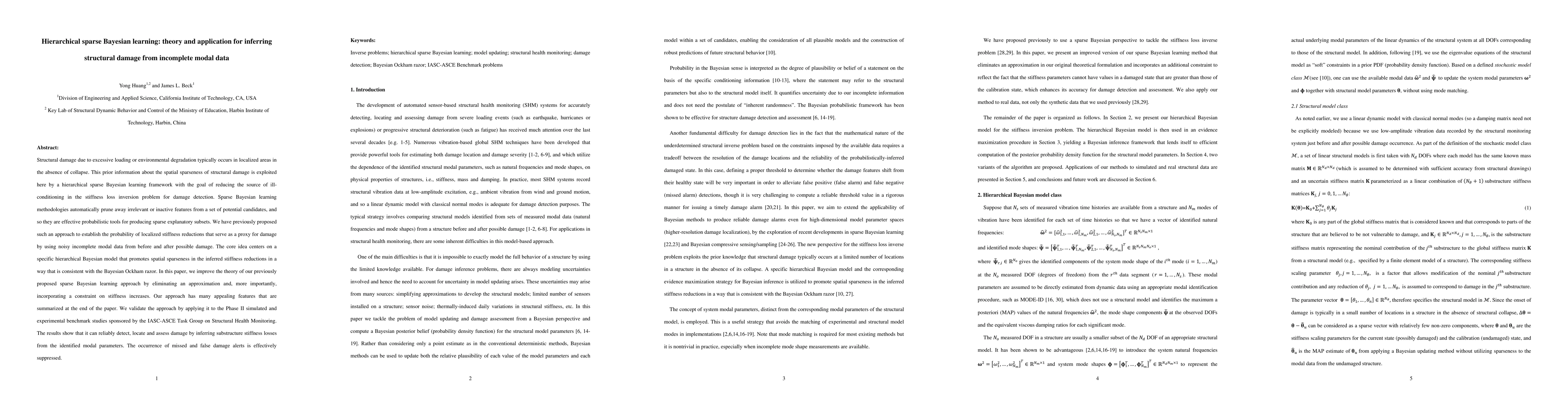 This paper proposes an improved hierarchical sparse Bayesian learning framework to detect structural damage from incomplete modal data, leveraging spatial sparseness and eliminating previous approximations. The refined model effectively identifies and assesses damage by minimizing false alarms and missed detections, validated through benchmark studies.