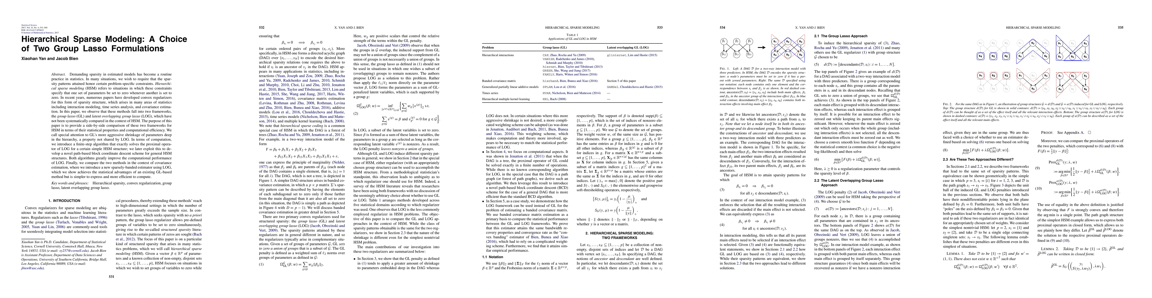 Demanding sparsity in estimated models has become a routine practice in statistics. In many situations, we wish to require that the sparsity patterns attained honor certain problem-specific constraints. Hierarchical sparse modeling (HSM) refers to situations in which these constraints specify that one set of parameters be set to zero whenever another is set to zero. In recent years, numerous papers have developed convex regularizers for this form of sparsity structure, which arises in many areas of statistics including interaction modeling, time series analysis, and covariance estimation. In this paper, we observe that these methods fall into two frameworks, the group lasso (GL) and latent overlapping group lasso (LOG), which have not been systematically compared in the context of HSM. The purpose of this paper is to provide a side-by-side comparison of these two frameworks for HSM in terms of their statistical properties and computational efficiency. We call special attention to GL's more aggressive shrinkage of parameters deep in the hierarchy, a property not shared by LOG. In terms of computation, we introduce a finite-step algorithm that exactly solves the proximal operator of LOG for a certain simple HSM structure; we later exploit this to develop a novel path-based block coordinate descent scheme for general HSM structures. Both algorithms greatly improve the computational performance of LOG. Finally, we compare the two methods in the context of covariance estimation, where we introduce a new sparsely-banded estimator using LOG, which we show achieves the statistical advantages of an existing GL-based method but is simpler to express and more efficient to compute.