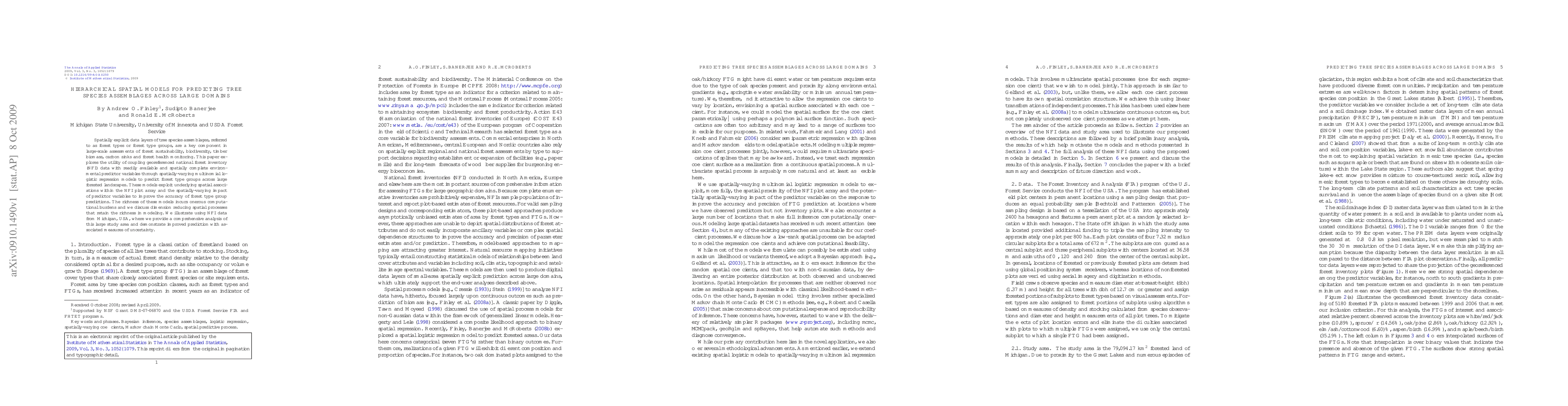 This paper develops hierarchical spatial models to predict tree species assemblages across large forested areas using georeferenced national forest inventory data and environmental predictors. It demonstrates improved accuracy and uncertainty measures in predicting forest type groups in Michigan, USA, while addressing computational challenges through dimension reduction techniques.