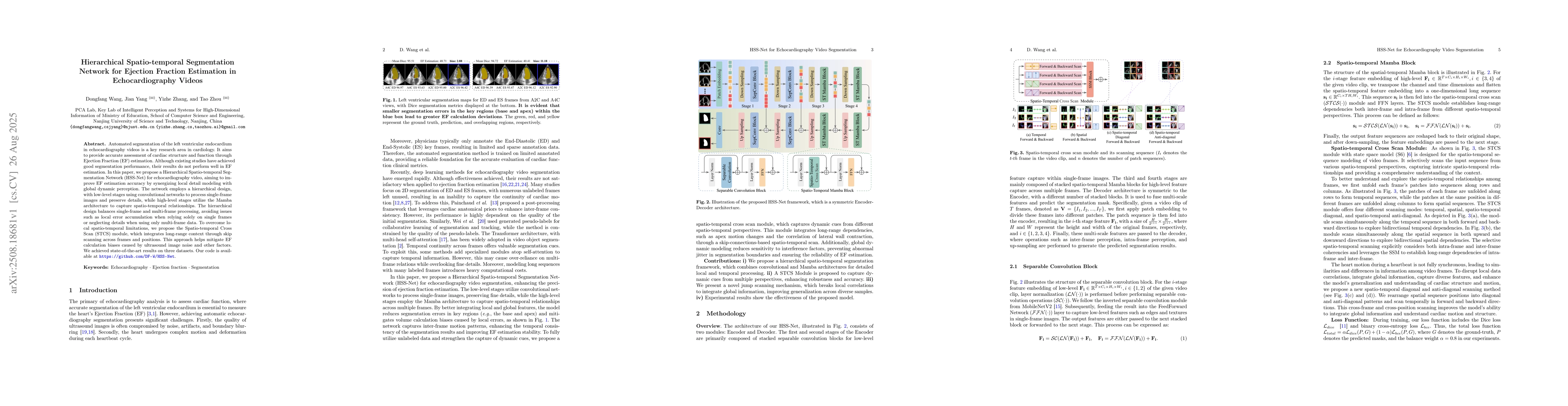 Automated segmentation of the left ventricular endocardium in echocardiography videos is a key research area in cardiology. It aims to provide accurate assessment of cardiac structure and function through Ejection Fraction (EF) estimation. Although existing studies have achieved good segmentation performance, their results do not perform well in EF estimation. In this paper, we propose a Hierarchical Spatio-temporal Segmentation Network (\ourmodel) for echocardiography video, aiming to improve EF estimation accuracy by synergizing local detail modeling with global dynamic perception. The network employs a hierarchical design, with low-level stages using convolutional networks to process single-frame images and preserve details, while high-level stages utilize the Mamba architecture to capture spatio-temporal relationships. The hierarchical design balances single-frame and multi-frame processing, avoiding issues such as local error accumulation when relying solely on single frames or neglecting details when using only multi-frame data. To overcome local spatio-temporal limitations, we propose the Spatio-temporal Cross Scan (STCS) module, which integrates long-range context through skip scanning across frames and positions. This approach helps mitigate EF calculation biases caused by ultrasound image noise and other factors.