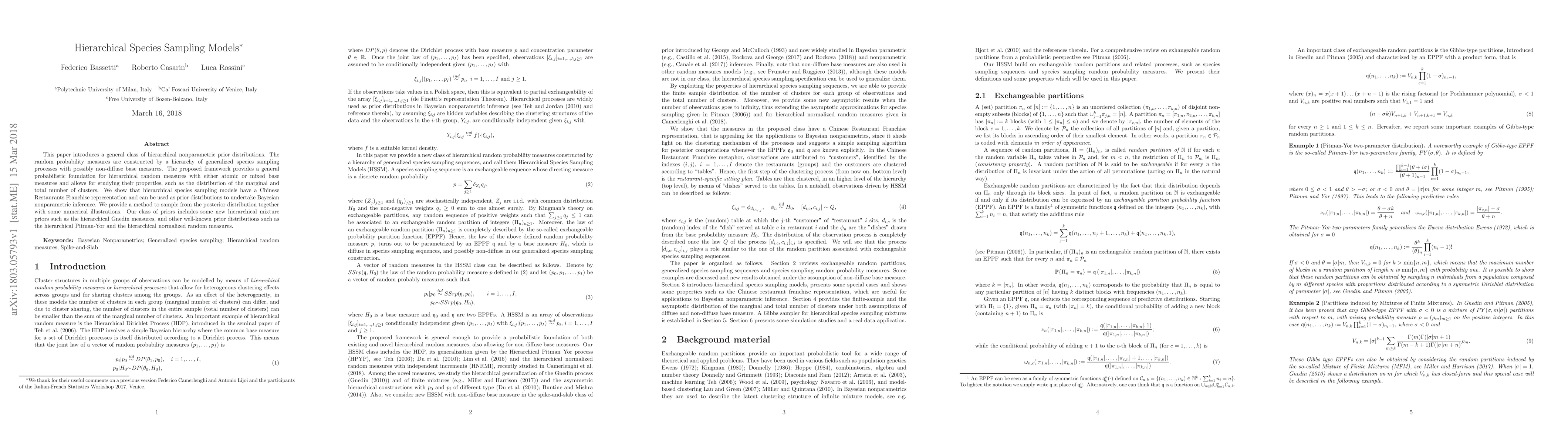 This paper proposes a class of hierarchical nonparametric prior distributions based on generalized species sampling processes, offering a probabilistic foundation for random measures with atomic or mixed base measures. It introduces a Chinese Restaurants Franchise representation and provides a method for Bayesian nonparametric inference, including new hierarchical mixture priors.