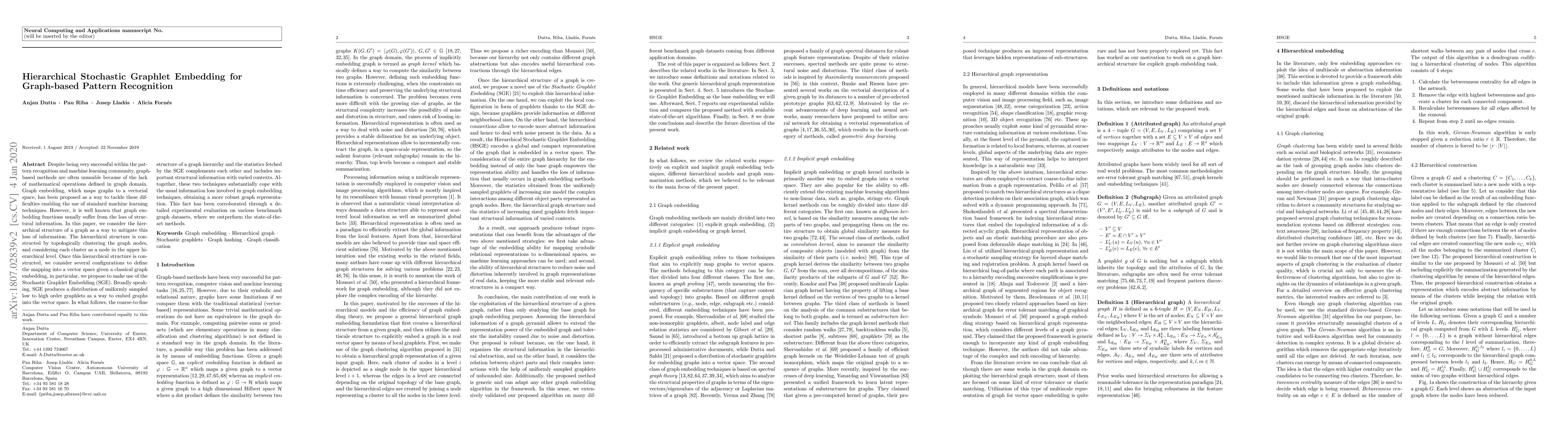 This paper proposes a hierarchical stochastic graphlet embedding method to enhance graph-based pattern recognition by mitigating the loss of structural information in graph embedding. The approach constructs a hierarchical graph structure and combines it with Stochastic Graphlet Embedding to provide a robust graph representation, achieving superior performance on benchmark datasets compared to state-of-the-art methods.
