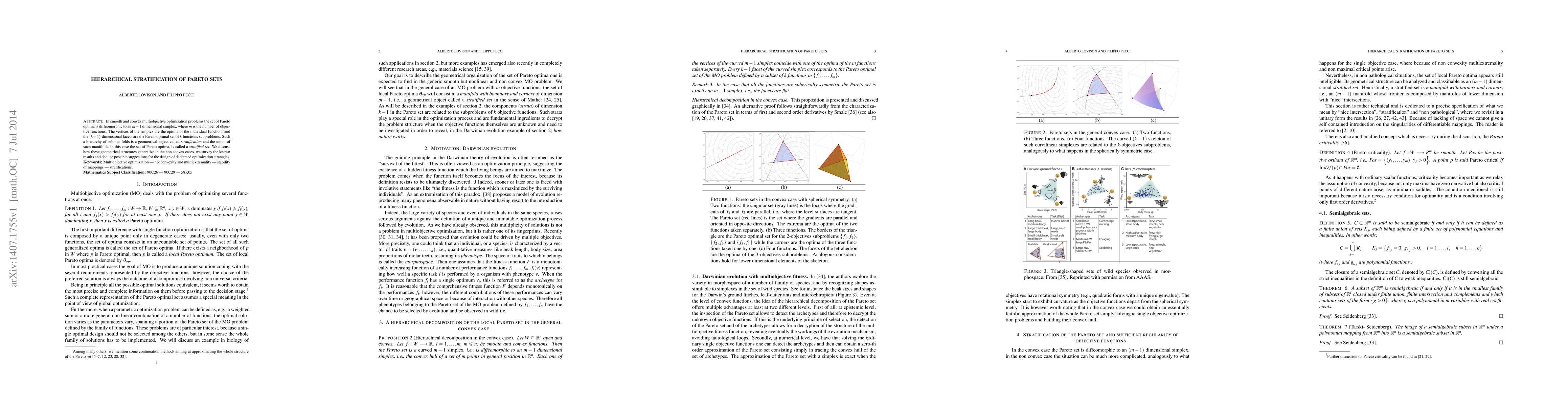 In smooth and convex multiobjective optimization problems the set of Pareto optima is diffeomorphic to an $m-1$ dimensional simplex, where $m$ is the number of objective functions. The vertices of the simplex are the optima of the individual functions and the $(k-1)$-dimensional facets are the Pareto optimal set of $k$ functions subproblems. Such a hierarchy of submanifolds is a geometrical object called stratification and the union of such manifolds, in this case the set of Pareto optima, is called a stratified set. We discuss how these geometrical structures generalize in the non convex cases, we survey the known results and deduce possible suggestions for the design of dedicated optimization strategies.