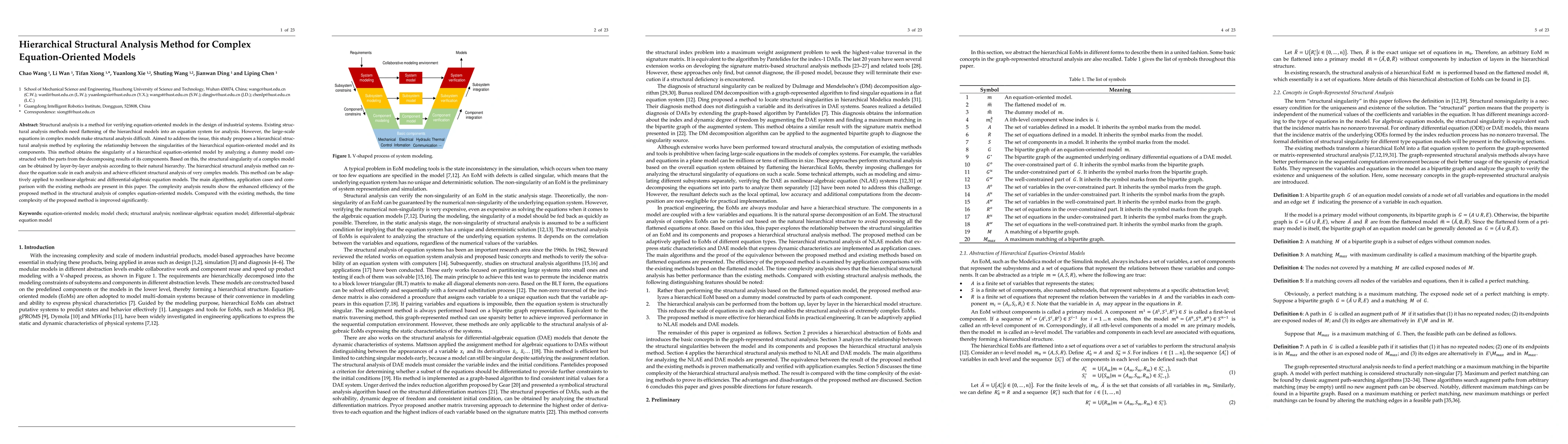 This paper proposes a hierarchical structural analysis method to efficiently analyze complex equation-oriented models by decomposing them into manageable components, reducing equation scale, and achieving significant time complexity improvements over existing methods. The method is applicable to nonlinear-algebraic and differential-algebraic equation models.