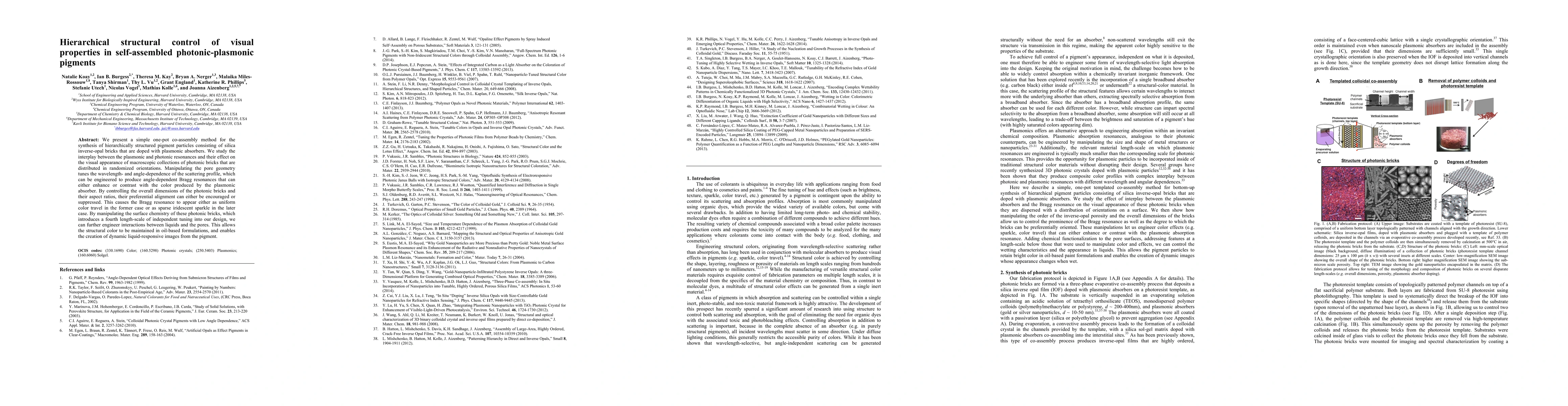 We present a simple one-pot co-assembly method for the synthesis of hierarchically structured pigment particles consisting of silica inverse-opal bricks that are doped with plasmonic absorbers. We study the interplay between the plasmonic and photonic resonances and their effect on the visual appearance of macroscopic collections of photonic bricks that are distributed in randomized orientations. Manipulating the pore geometry tunes the wavelength- and angle-dependence of the scattering profile, which can be engineered to produce angle-dependent Bragg resonances that can either enhance or contrast with the color produced by the plasmonic absorber. By controlling the overall dimensions of the photonic bricks and their aspect ratios, their preferential alignment can either be encouraged or suppressed. This causes the Bragg resonance to appear either as uniform color travel in the former case or as sparse iridescent sparkle in the later case. By manipulating the surface chemistry of these photonic bricks, which introduces a fourth length-scale of independent tuning into our design, we can further engineer interactions between liquids and the pores. This allows the structural color to be maintained in oil-based formulations, and enables the creation of dynamic liquid-responsive images from the pigment.