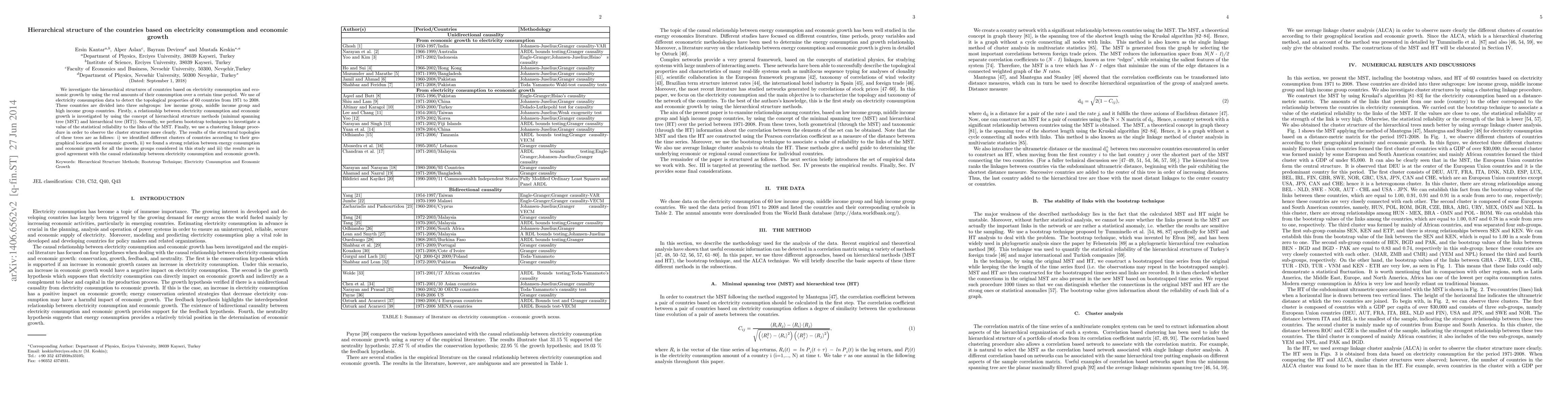 This paper analyzes hierarchical structures of 60 countries categorized by income based on electricity consumption and economic growth from 1971 to 2008. Using MST and HT, it identifies clusters and confirms a strong relationship between energy consumption and economic growth across all income groups.