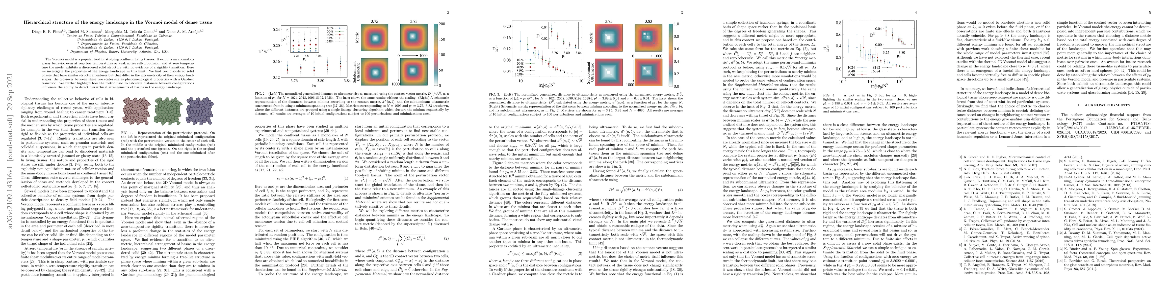 The Voronoi model is a popular tool for studying confluent living tissues. It exhibits an anomalous glassy behavior even at very low temperatures or weak active self-propulsion, and at zero temperature the model exhibits a disordered solid structure with no evidence of a rigidity transition. Here we investigate the properties of the energy landscape in this limit. We find two disordered solid phases that have similar structural features but that differ in the ultrametricity of their energy landscapes; the crossover between these two states shares phenomenological properties with a Gardner transition. We further highlight how the metric used to calculate distances between configurations influences the ability to detect hierarchical arrangements of basins in the energy landscape.
