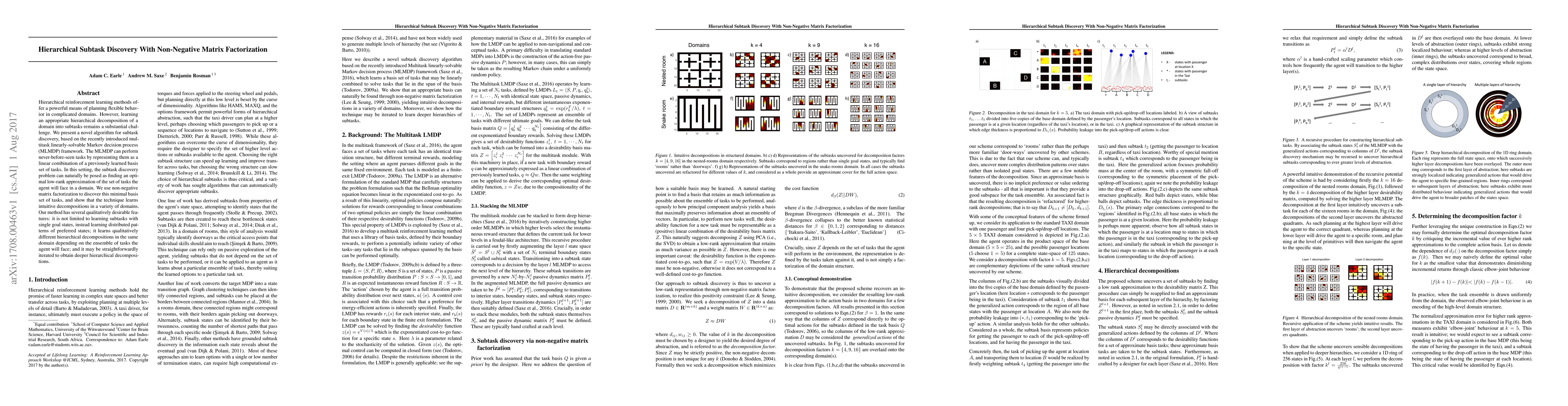 This paper introduces a novel algorithm using non-negative matrix factorization for discovering hierarchical subtasks in reinforcement learning, enabling flexible behavior planning. The method learns intuitive, distributed patterns of preferred states and can iteratively obtain deeper hierarchical decompositions.