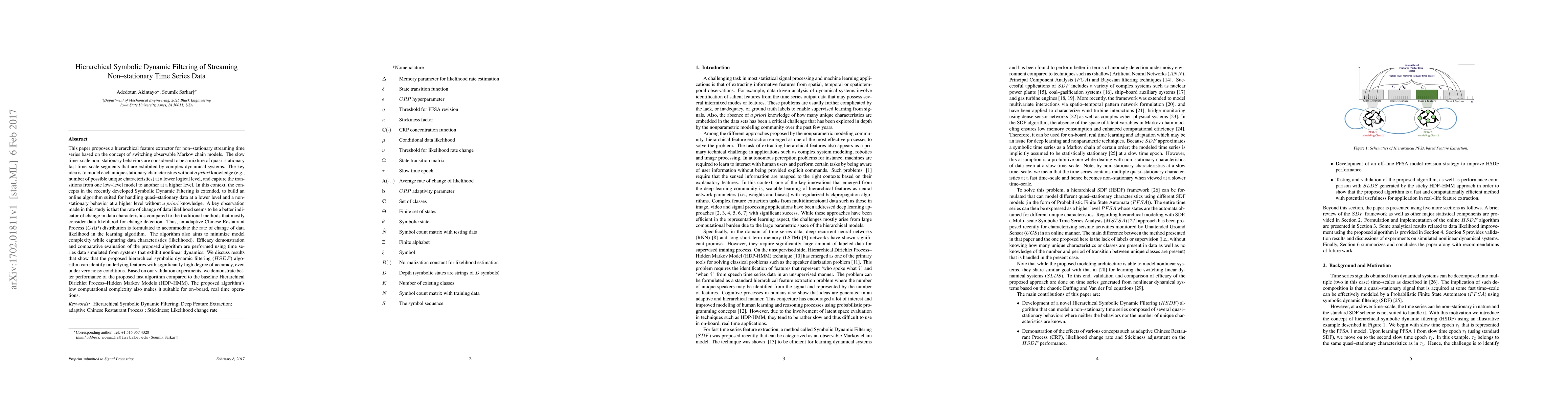 This paper proposes a hierarchical feature extractor for non-stationary streaming time series based on the concept of switching observable Markov chain models. The slow time-scale non-stationary behaviors are considered to be a mixture of quasi-stationary fast time-scale segments that are exhibited by complex dynamical systems. The idea is to model each unique stationary characteristic without a priori knowledge (e.g., number of possible unique characteristics) at a lower logical level, and capture the transitions from one low-level model to another at a higher level. In this context, the concepts in the recently developed Symbolic Dynamic Filtering (SDF) is extended, to build an online algorithm suited for handling quasi-stationary data at a lower level and a non-stationary behavior at a higher level without a priori knowledge. A key observation made in this study is that the rate of change of data likelihood seems to be a better indicator of change in data characteristics compared to the traditional methods that mostly consider data likelihood for change detection. The algorithm minimizes model complexity and captures data likelihood. Efficacy demonstration and comparative evaluation of the proposed algorithm are performed using time series data simulated from systems that exhibit nonlinear dynamics. We discuss results that show that the proposed hierarchical SDF algorithm can identify underlying features with significantly high degree of accuracy, even under very noisy conditions. Algorithm is demonstrated to perform better than the baseline Hierarchical Dirichlet Process-Hidden Markov Models (HDP-HMM). The low computational complexity of algorithm makes it suitable for on-board, real time operations.