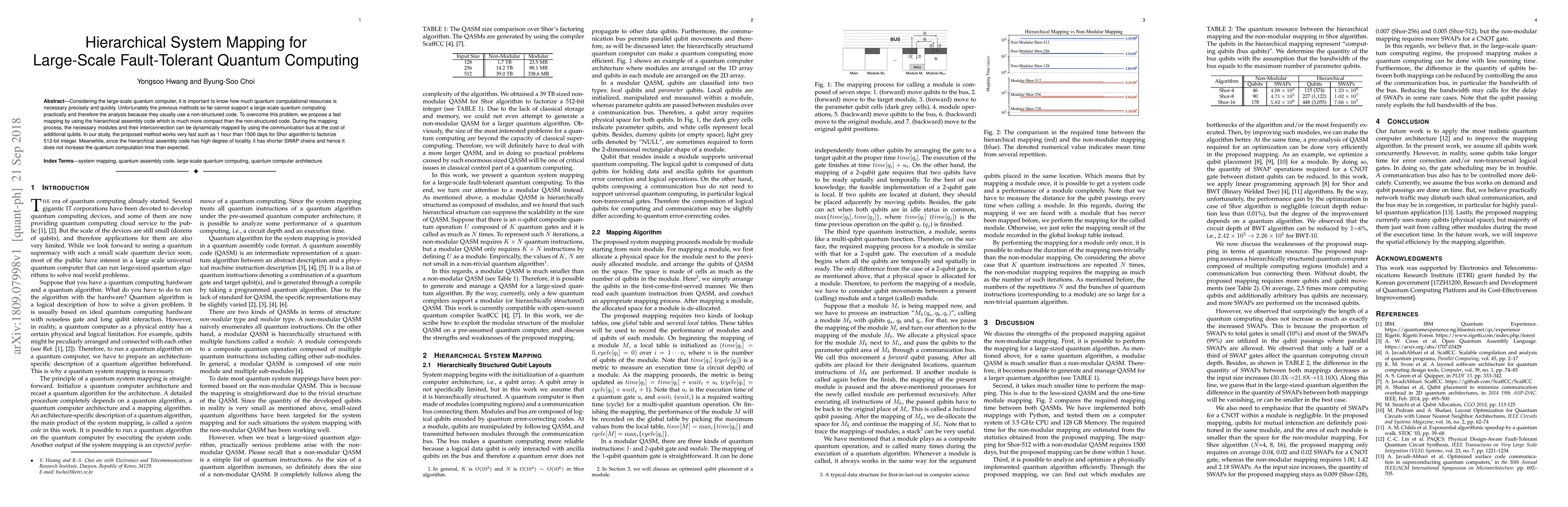 Considering the large-scale quantum computer, it is important to know how much quantum computational resources is necessary precisely and quickly. Unfortunately the previous methods so far cannot support a large-scale quantum computing practically and therefore the analysis because they usually use a non-structured code. To overcome this problem, we propose a fast mapping by using the hierarchical assembly code which is much more compact than the non-structured code. During the mapping process, the necessary modules and their interconnection can be dynamically mapped by using the communication bus at the cost of additional qubits. In our study, the proposed method works very fast such as 1 hour than 1500 days for Shor algorithm to factorize 512-bit integer. Meanwhile, since the hierarchical assembly code has high degree of locality, it has shorter SWAP chains and hence it does not increase the quantum computation time than expected.
