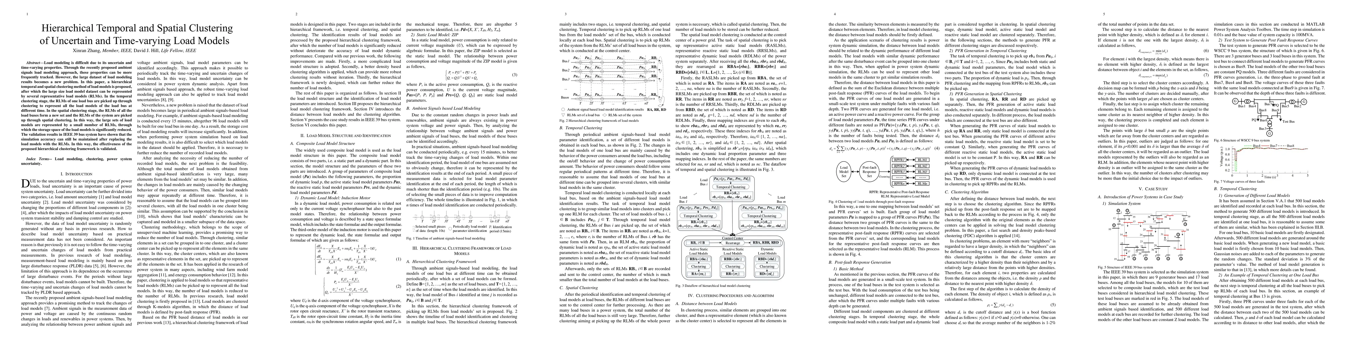 This paper proposes a hierarchical clustering method to manage large datasets of uncertain and time-varying load models, reducing storage space while maintaining simulation accuracy. The method involves temporal clustering for individual load buses and spatial clustering for the entire system, resulting in representative load models that effectively condense the original dataset.