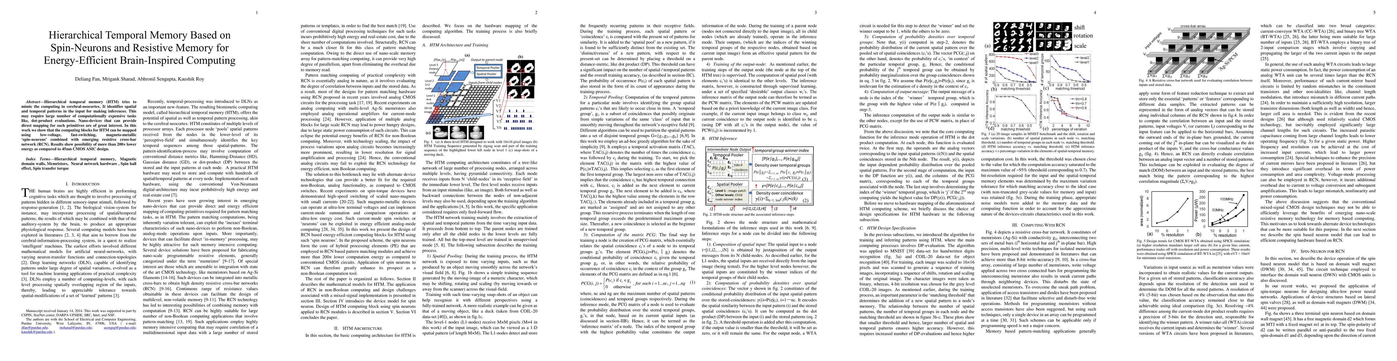 This paper proposes a brain-inspired computing model using hierarchical temporal memory (HTM) implemented with spin-neurons and resistive cross-bar networks, demonstrating significant energy efficiency improvements over traditional CMOS ASICs, achieving over 200x lower energy consumption.