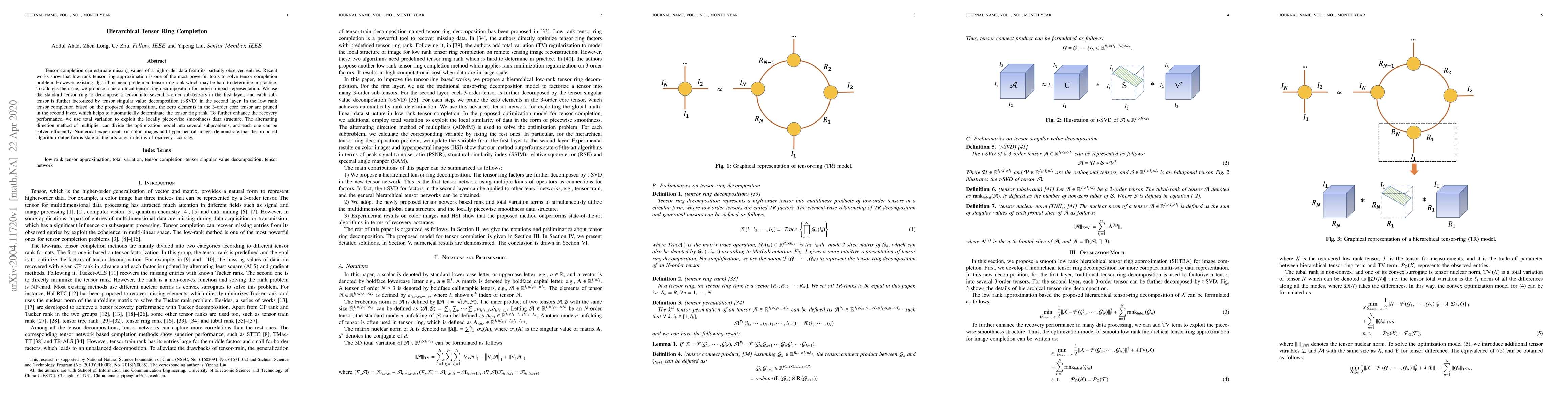 The paper proposes a hierarchical tensor ring decomposition method for tensor completion that automatically determines the tensor ring rank by pruning zero elements in the core tensor. The approach uses tensor singular value decomposition and total variation for enhanced recovery performance, and outperforms existing methods in experiments on color and hyperspectral images.