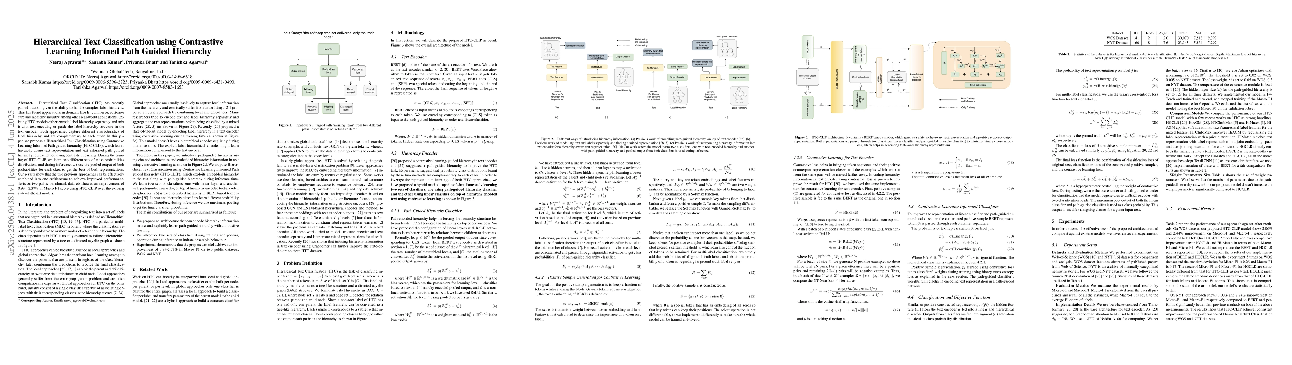 Hierarchical Text Classification (HTC) has recently gained traction given the ability to handle complex label hierarchy. This has found applications in domains like E- commerce, customer care and medicine industry among other real-world applications. Existing HTC models either encode label hierarchy separately and mix it with text encoding or guide the label hierarchy structure in the text encoder. Both approaches capture different characteristics of label hierarchy and are complementary to each other. In this paper, we propose a Hierarchical Text Classification using Contrastive Learning Informed Path guided hierarchy (HTC-CLIP), which learns hierarchy-aware text representation and text informed path guided hierarchy representation using contrastive learning. During the training of HTC-CLIP, we learn two different sets of class probabilities distributions and during inference, we use the pooled output of both probabilities for each class to get the best of both representations. Our results show that the two previous approaches can be effectively combined into one architecture to achieve improved performance. Tests on two public benchmark datasets showed an improvement of 0.99 - 2.37% in Macro F1 score using HTC-CLIP over the existing state-of-the-art models.