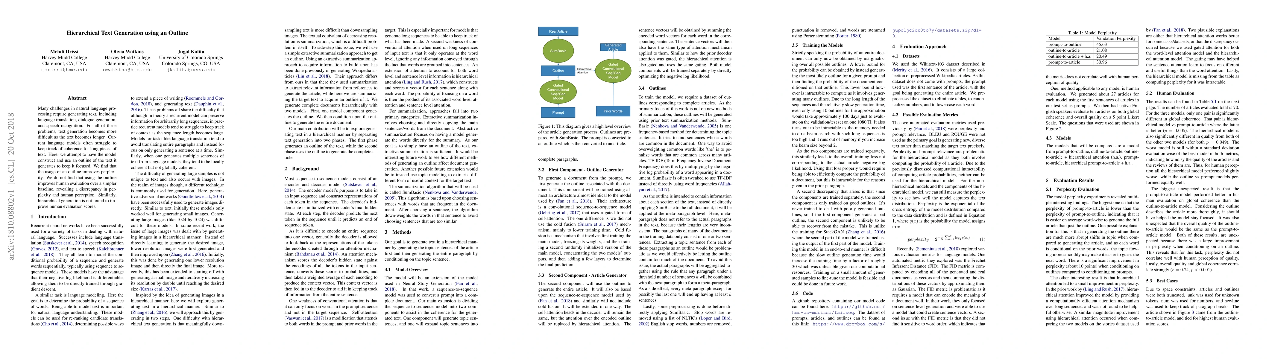 This paper explores hierarchical text generation using an outline to improve coherence in long text pieces, finding reduced perplexity but no significant improvement in human evaluation compared to a simpler baseline. The study highlights a discrepancy between model performance metrics and human perception.