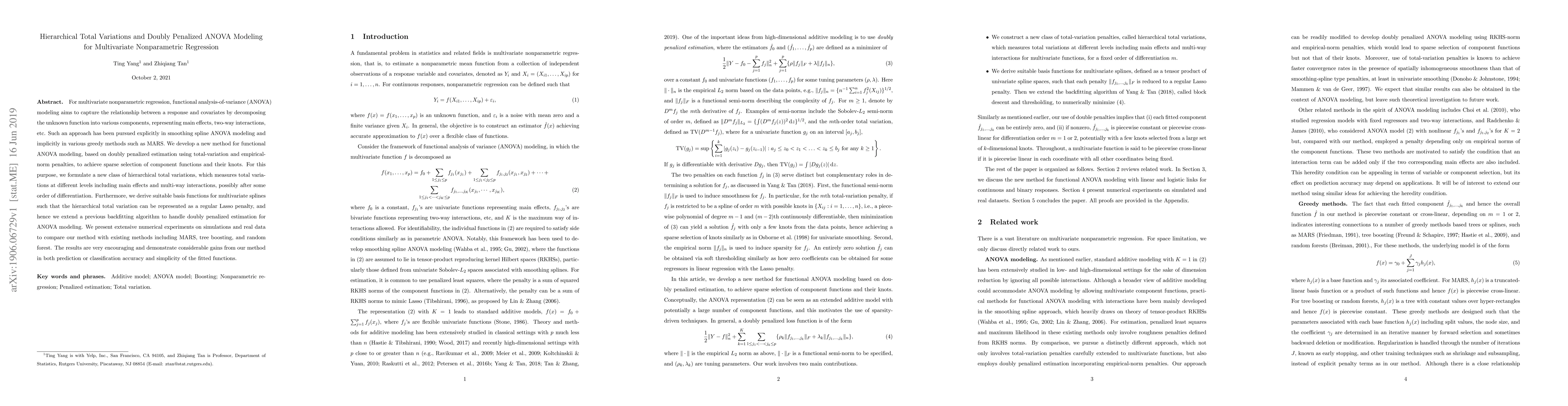 This paper introduces a novel doubly penalized ANOVA modeling approach for multivariate nonparametric regression, utilizing hierarchical total variations and a new class of basis functions for multivariate splines. The method achieves sparse selection of component functions and demonstrates superior prediction and classification accuracy compared to existing methods.