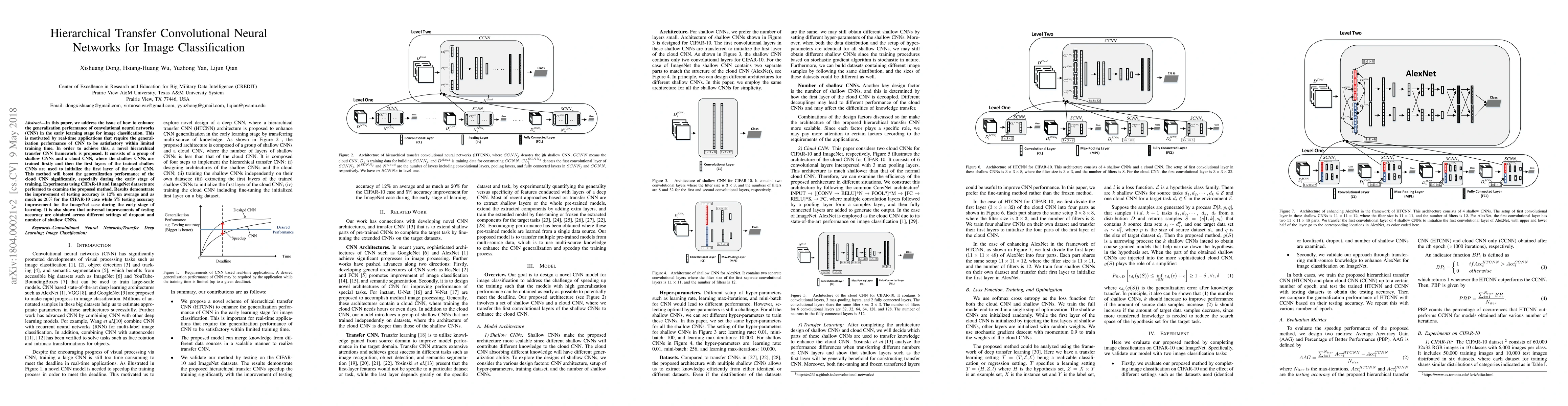 This paper proposes a hierarchical transfer CNN framework to improve the early-stage generalization performance of CNNs in image classification. The method involves training shallow CNNs first, then initializing the first layer of a 'cloud CNN' with the trained shallow CNNs' weights. Experiments show a 12% average improvement in testing accuracy on CIFAR-10 and ImageNet datasets, with up to 20% improvement in CIFAR-10's early stage, and 5% in ImageNet. This approach also demonstrates consistent improvements across various dropout and shallow CNN settings.