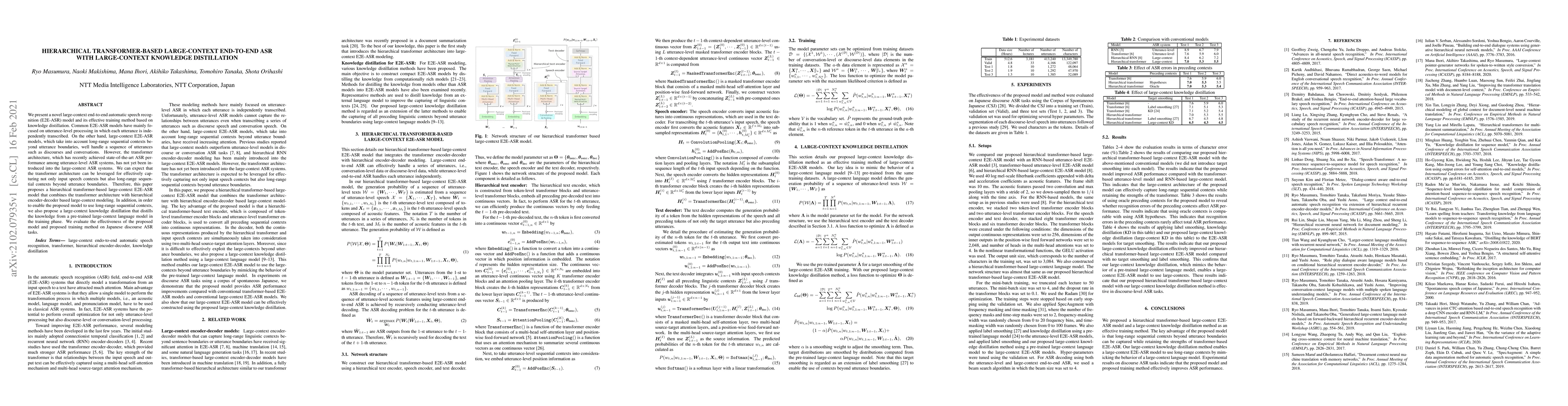 A new speech recognition model combines transformer architecture with large-context modeling to improve ASR performance on conversations and discourses. The model uses knowledge distillation from a pre-trained language model to capture long-range sequential contexts.