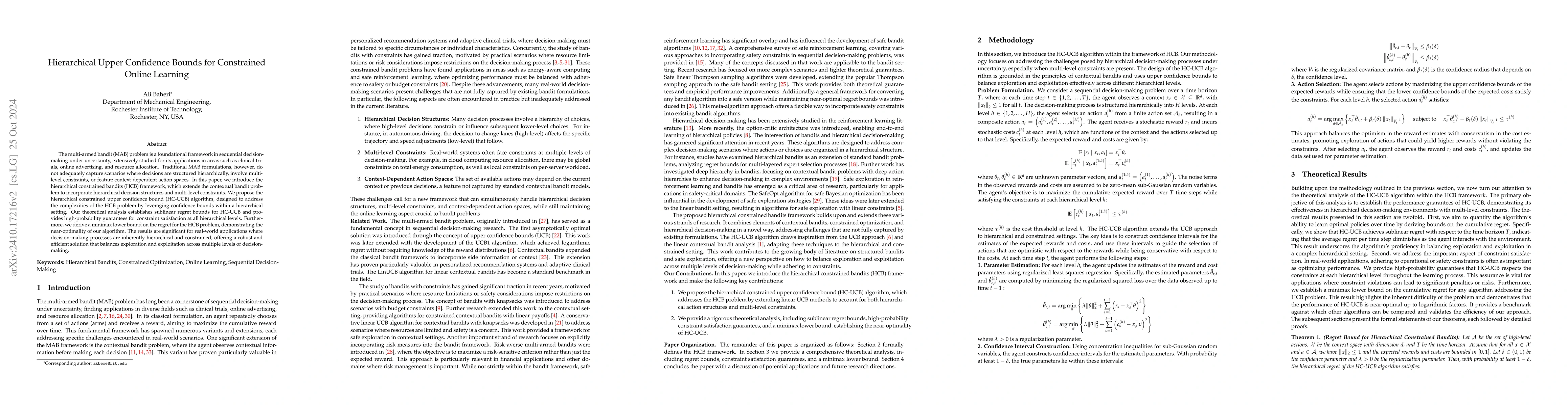 This paper introduces the hierarchical constrained bandits (HCB) framework to extend contextual bandits for multi-level decision-making under hierarchical structures and constraints. It proposes the HC-UCB algorithm, which achieves sublinear regret and satisfies constraints at all levels, demonstrating near-optimality.