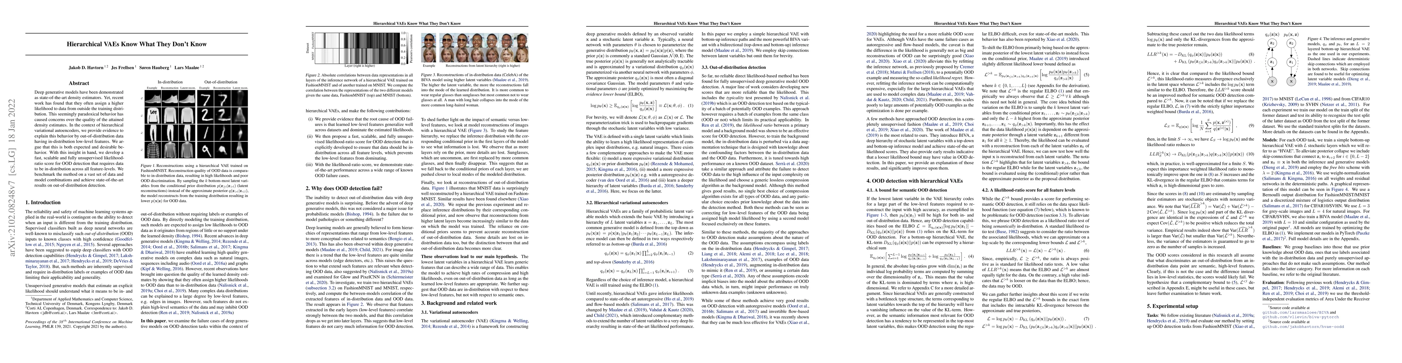 Deep generative models have been demonstrated as state-of-the-art density estimators. Yet, recent work has found that they often assign a higher likelihood to data from outside the training distribution. This seemingly paradoxical behavior has caused concerns over the quality of the attained density estimates. In the context of hierarchical variational autoencoders, we provide evidence to explain this behavior by out-of-distribution data having in-distribution low-level features. We argue that this is both expected and desirable behavior. With this insight in hand, we develop a fast, scalable and fully unsupervised likelihood-ratio score for OOD detection that requires data to be in-distribution across all feature-levels. We benchmark the method on a vast set of data and model combinations and achieve state-of-the-art results on out-of-distribution detection.